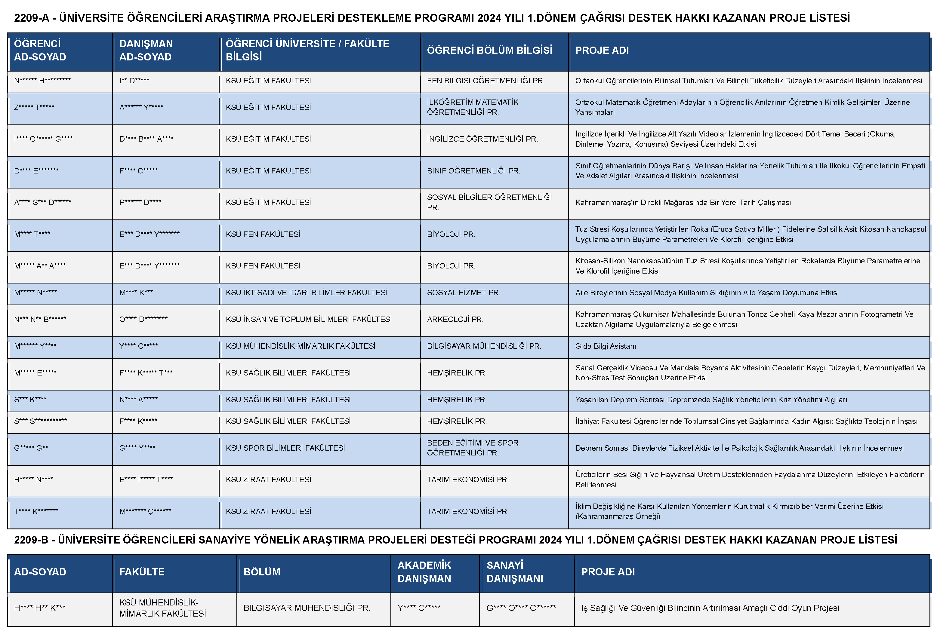 2209-A - Üniversite Öğrencileri Araştırma Projeleri Destekleme Programı 2024 Yılı 1.Dönem Çağrısı Destek Hakkı Kazanan Proje Listesi