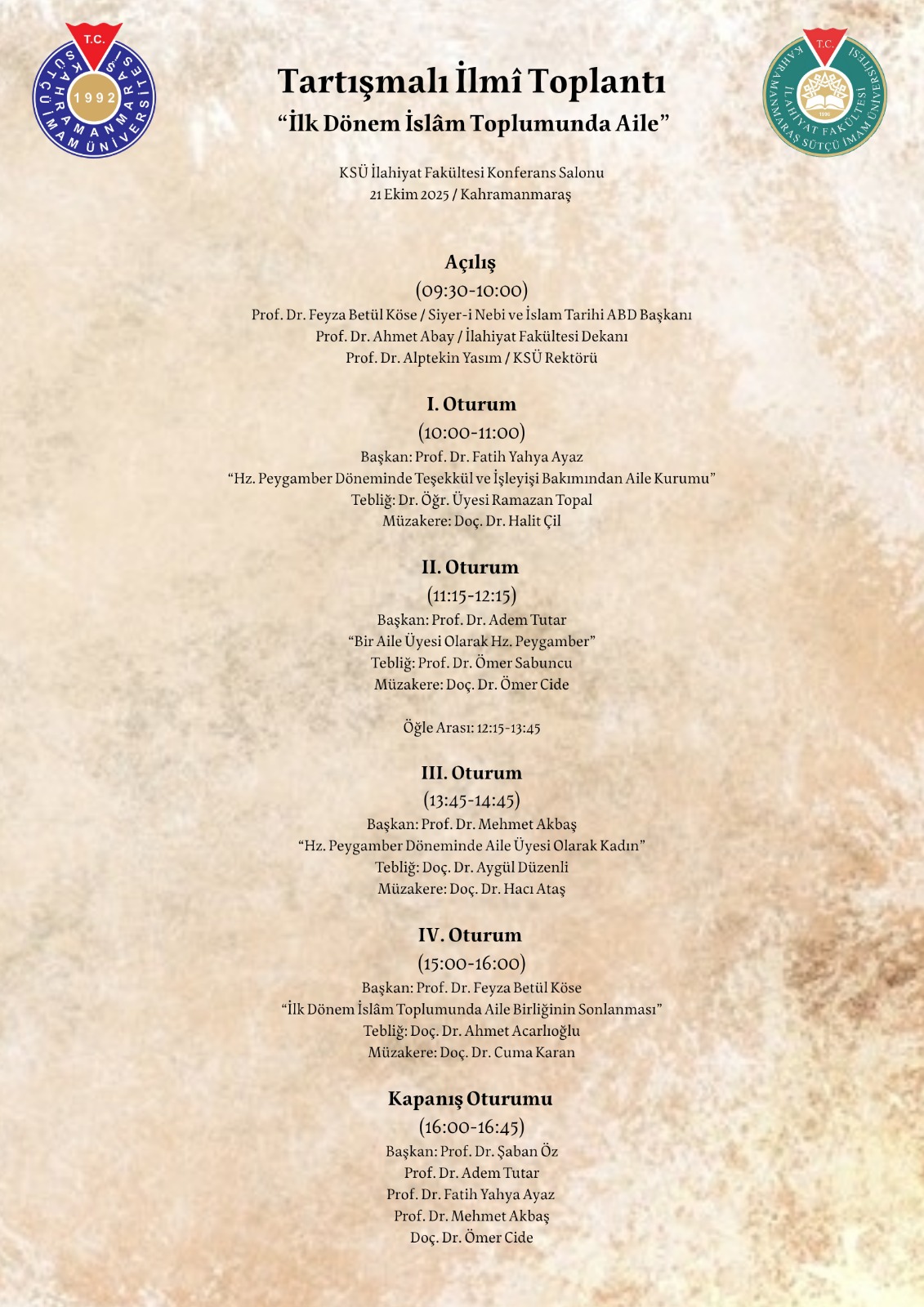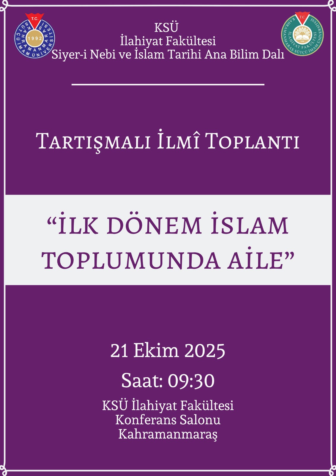 Fakültemiz Konferans Salonunda 21 Ekim 2025 Salı günü "İlk Dönem İslam Toplumunda Aile" konulu Tartışmalı İlmi Toplantı gerçekleştirilecektir.