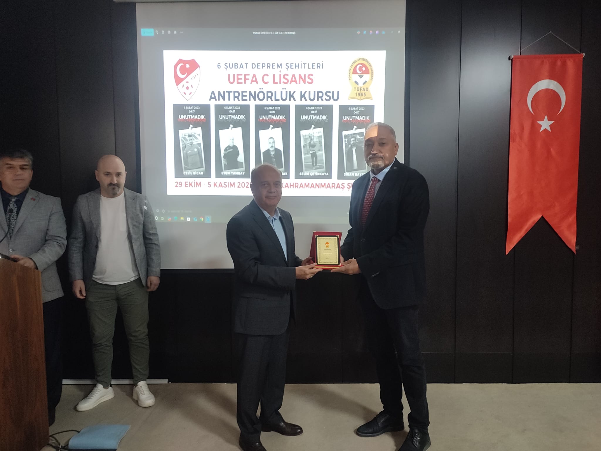 6 Şubat deprem şehitleri anısına düzenlenen UEFA C Lisans Antrenör Kursuna verdiği değerli katkılardan dolayı, Fakültemiz Dekanı Prof. Dr. Fatih Mengeloğlu’na plaket takdim edildi.
