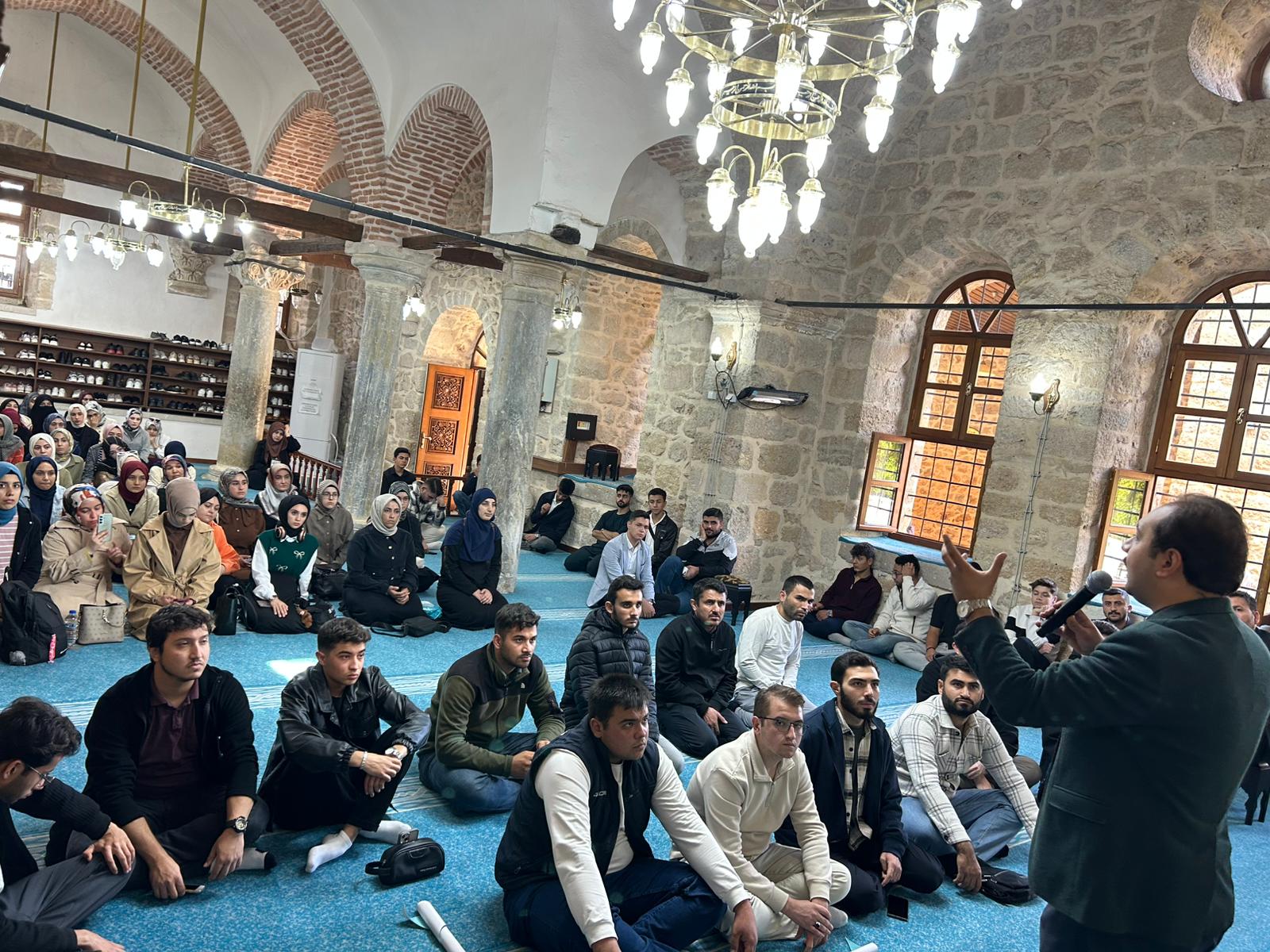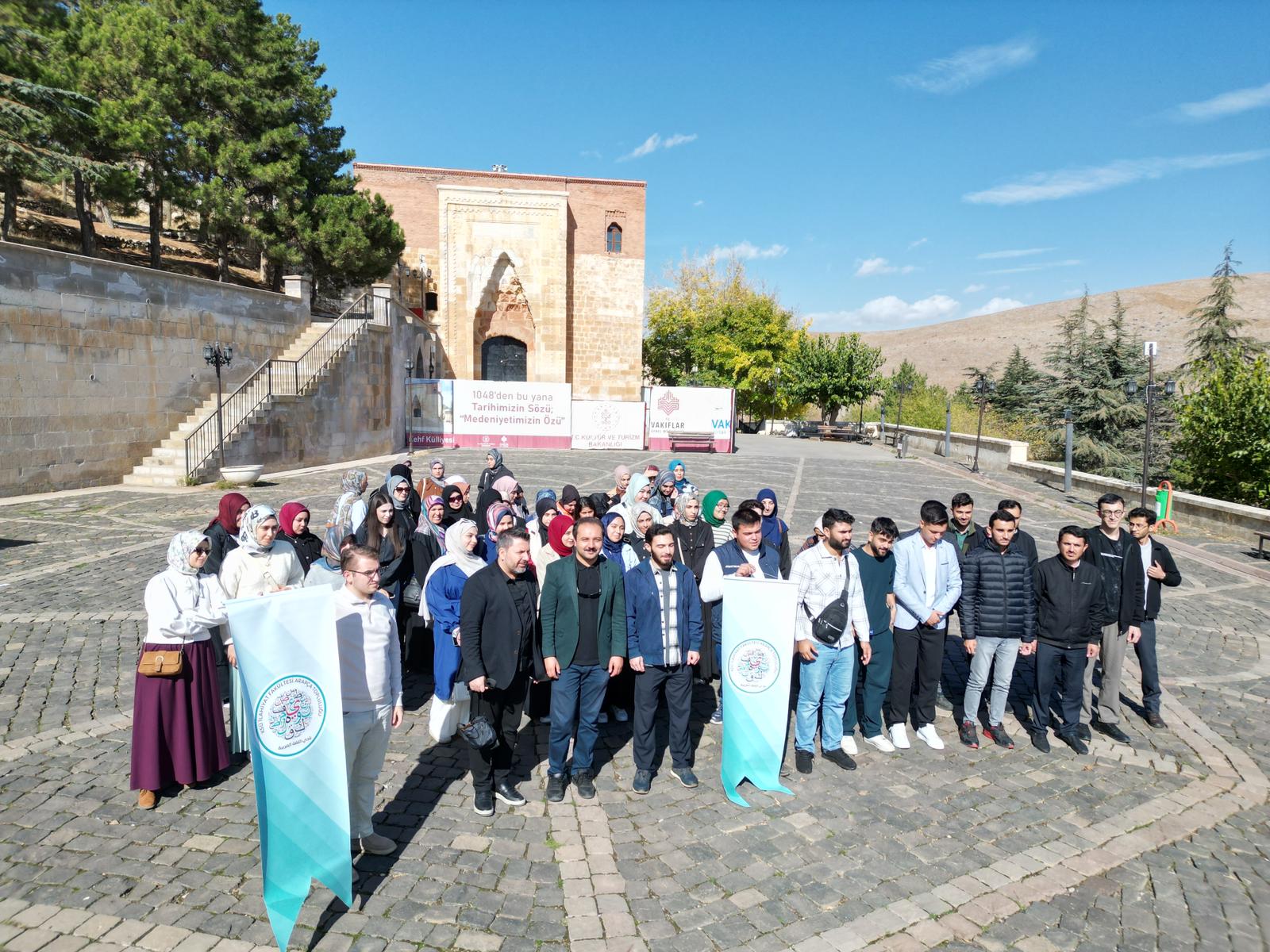 Kahramanmaraş ilimizin önemli dini ve kültürel miraslarından biri olan Eshâb-ı Kehf Külliyesi’ne gerçekleştirilen bu geziyle, İlahiyat Fakültesi hazırlık sınıfı öğrencilerimizin hem oryantasyon sürecine katkı sağlanmış hem de Kur’ân-ı Kerîm’de zikredilen tarihi bir mekânda tefekkür ve manevi derinleşme imkânı sunulmuştur. Bu ziyaretle, gençlerin iman eksenli direnişleri üzerinden günümüz gençliğine ahlaki sorumluluk, değer bilinci ve kimlik farkındalığı kazandırılması hedeflenmiştir. Aynı zamanda öğrencilerimizin şehrin manevi dokusuyla bütünleşerek akademik kimliklerini güçlendirmeleri amaçlanmıştır.