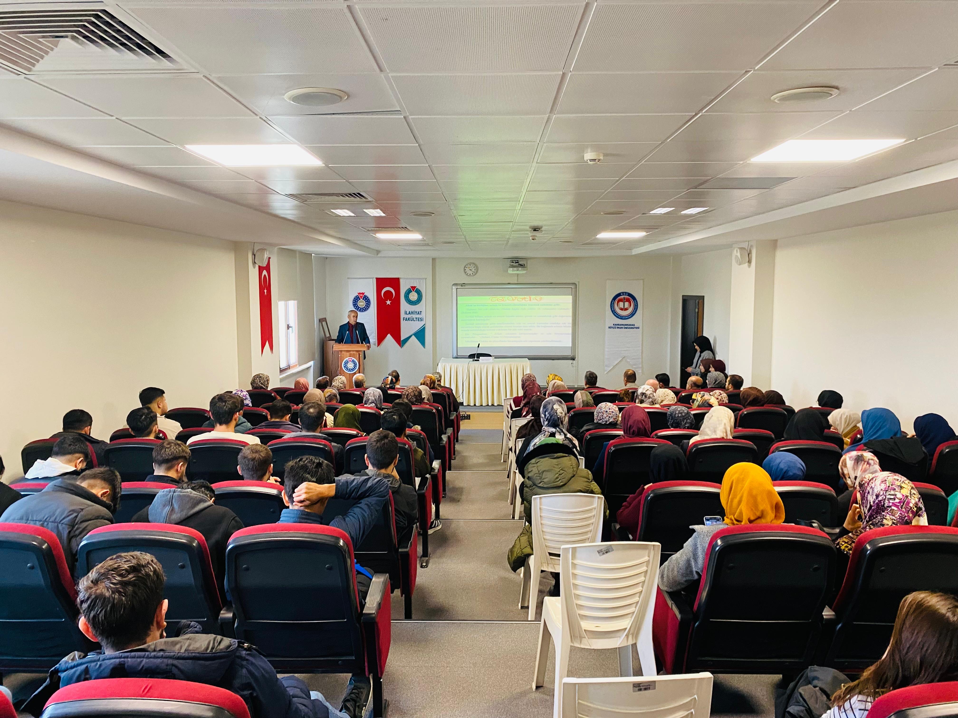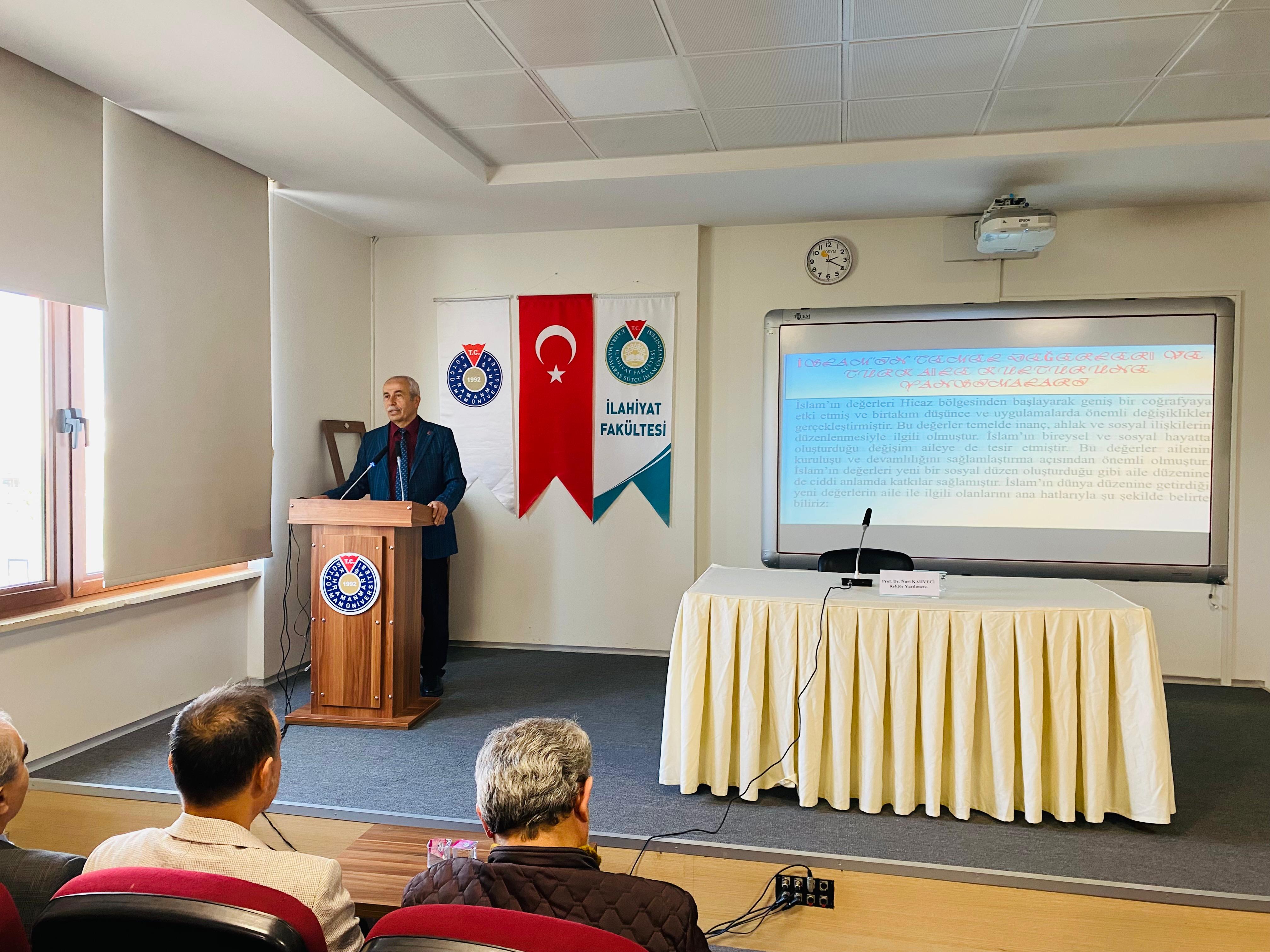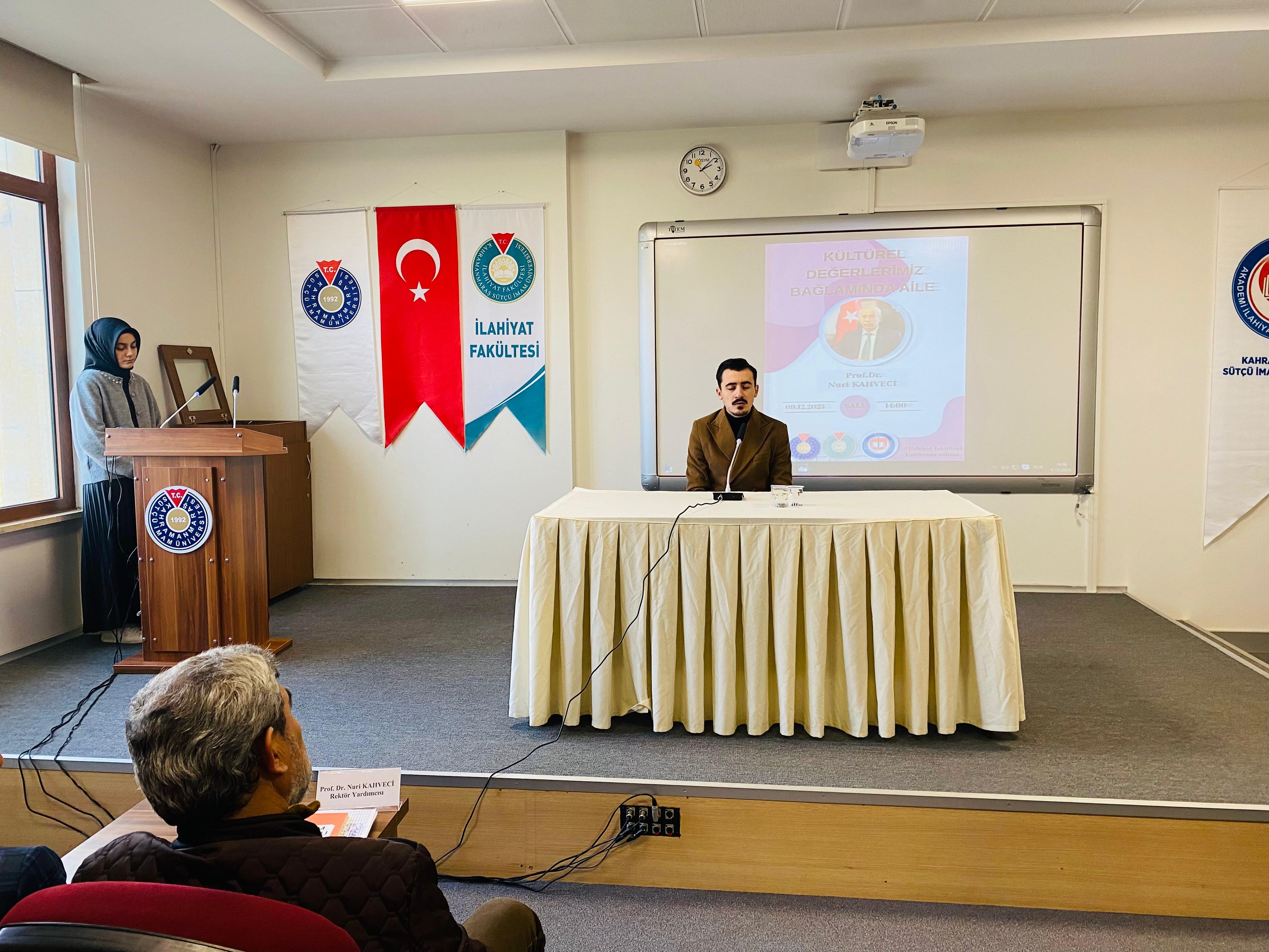 Kahramanmaraş Sütçü İmam Üniversitesi İlahiyat Fakültesi Konferans Salonu’nda, Üniversitemiz Rektör Yardımcısı ve İlahiyat Fakültesi Temel İslam Bilimleri Bölümü İslam Hukuku Anabilim Dalı Öğretim Üyesi Prof. Dr. Nuri KAHVECİ tarafından “Kültürel Değerlerimiz Bağlamında Aile” konulu bir konferans gerçekleştirildi.