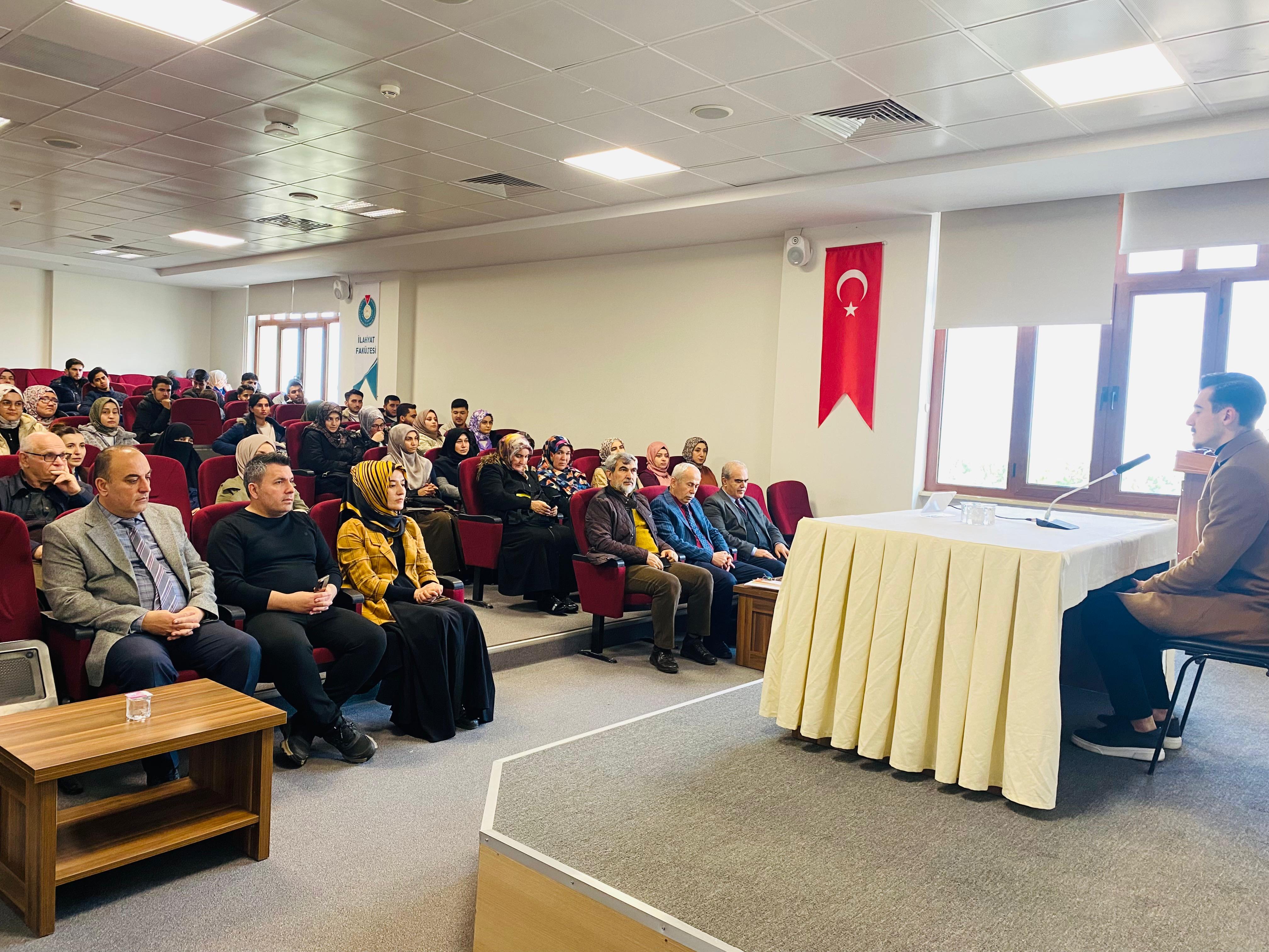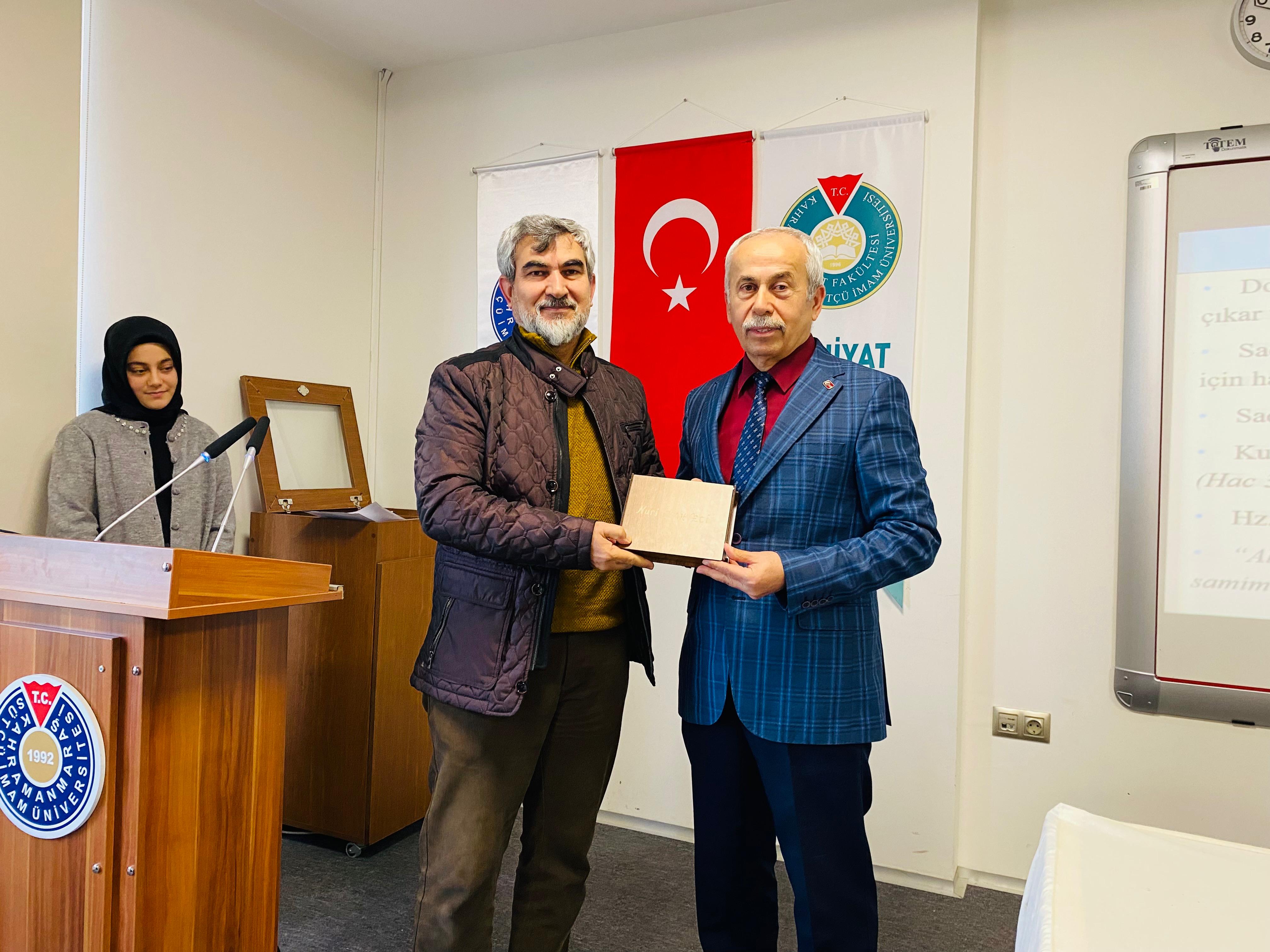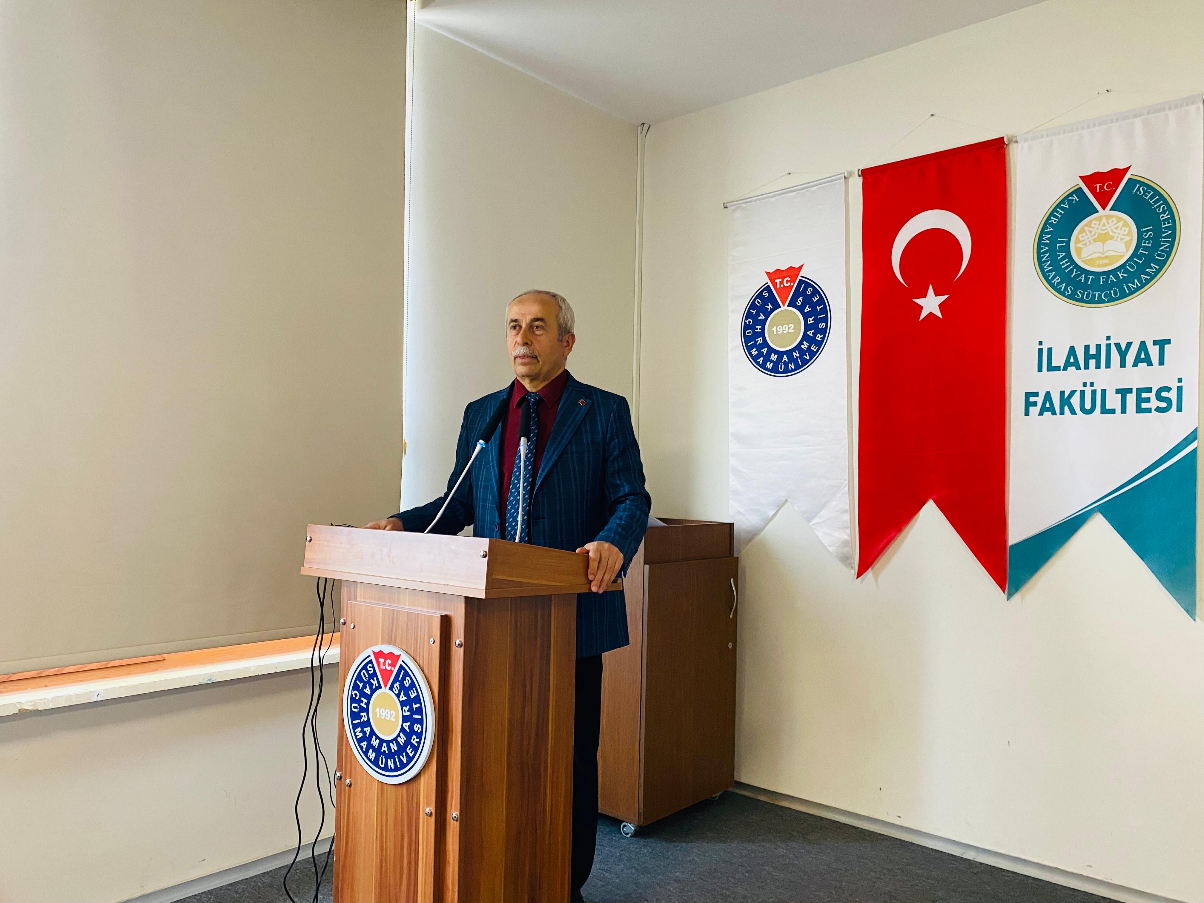 Kahramanmaraş Sütçü İmam Üniversitesi İlahiyat Fakültesi Konferans Salonu’nda, Üniversitemiz Rektör Yardımcısı ve İlahiyat Fakültesi Temel İslam Bilimleri Bölümü İslam Hukuku Anabilim Dalı Öğretim Üyesi Prof. Dr. Nuri KAHVECİ tarafından “Kültürel Değerlerimiz Bağlamında Aile” konulu bir konferans gerçekleştirildi.
