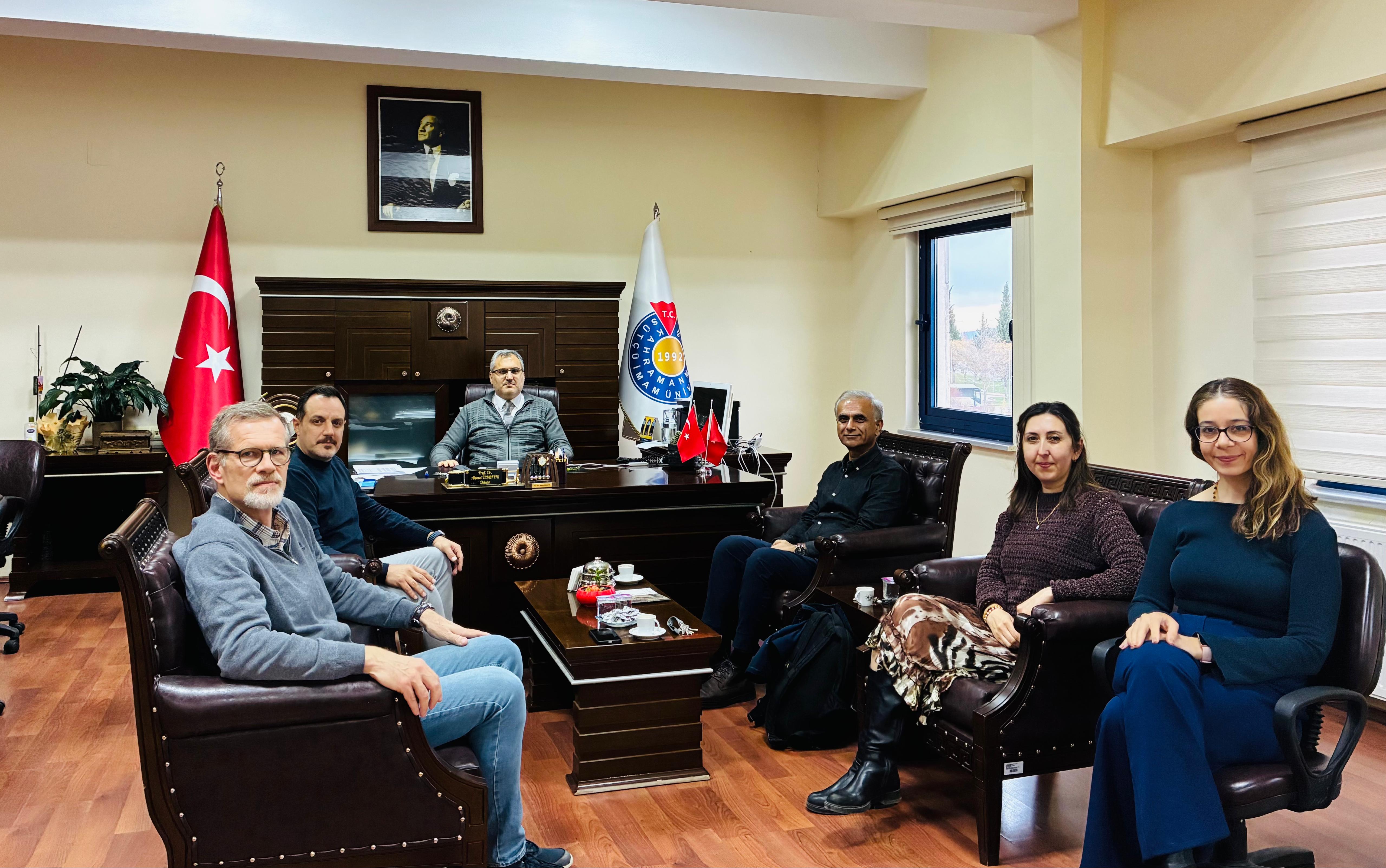 Doç. Dr. HASSAN, 16 Aralık 2025 Salı günü Fakültemiz Dekanı Prof. Dr. Ahmet TEKBIYIK'ı makamında ziyaret ederek çalışmasına verilen destekten dolayı teşekkürlerini ifade etti. Yabancı Diller Eğitimi Bölümü öğretim üyeleri Doç. Dr. Reyhan AĞÇAM, Dr. Öğr. Üyesi Yunus Emre AKBANA, Dr. Öğr. Üyesi Stefan RATHERT ve Dr. Öğr. Üyesi Nebahat BADEM'in de hazır bulunduğu ziyarette, özellikle 6 Şubat 2023 tarihinde meydana gelen Kahramanmaraş merkezli depremlerin ardından Türkiye'de yapılan bilimsel çalışmalar ve Üniversitemizdeki uluslararasılılaşma faaliyetleri üzerine sohbet edildi.