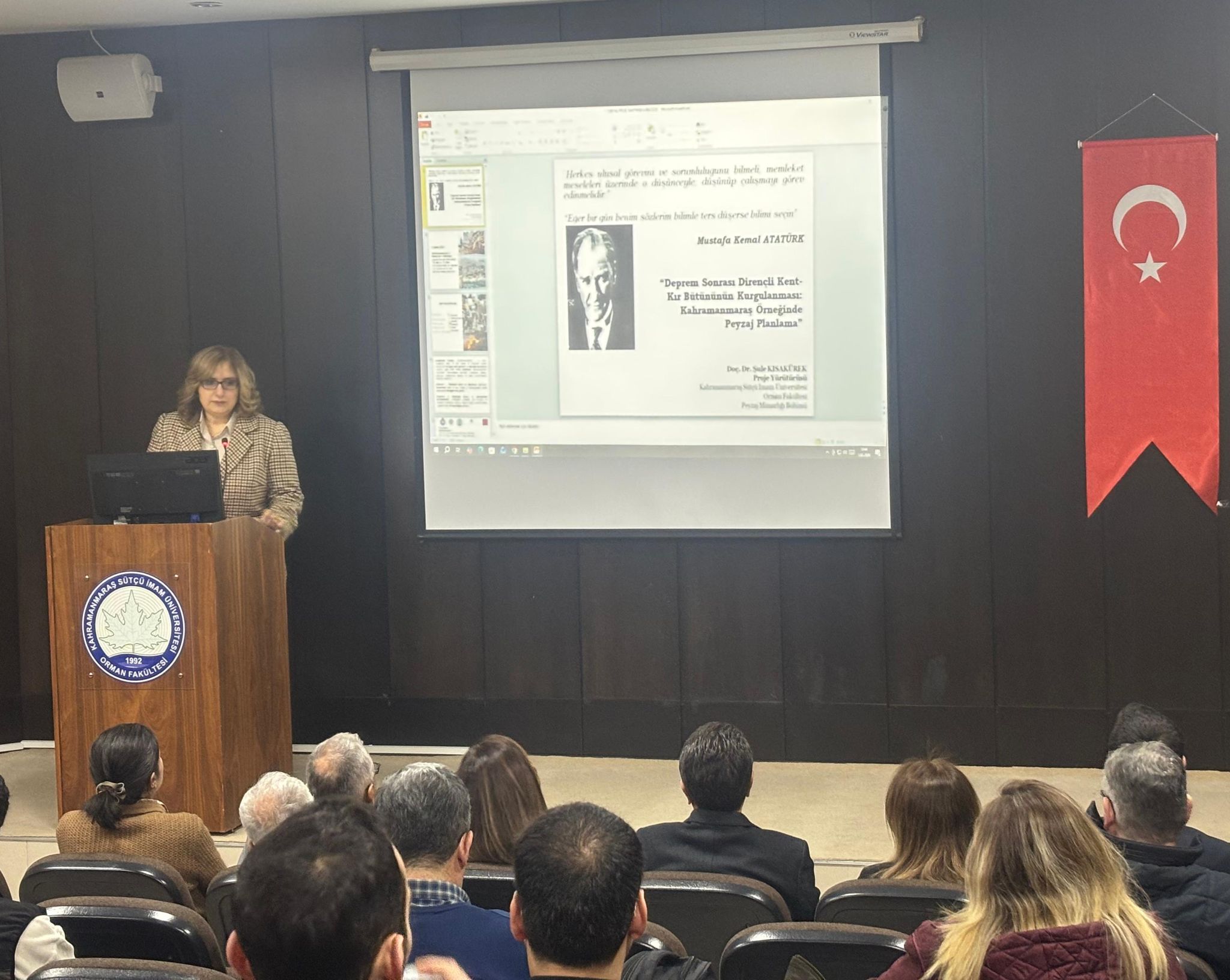 Çalıştay, Fakültemiz Peyzaj Mimarlığı Bölüm Başkanı ve proje yürütücüsü Doç. Dr. Şule Kısakürek ile Dekanımız Prof. Dr. Fatih Mengeloğlu’nun açılış konuşmalarıyla başlamıştır. Açılış konuşmalarında, deprem sonrası yeniden yapılanma sürecinde kent ve kır alanlarının bütüncül bir bakış açısıyla ele alınmasının önemi vurgulanmıştır.
