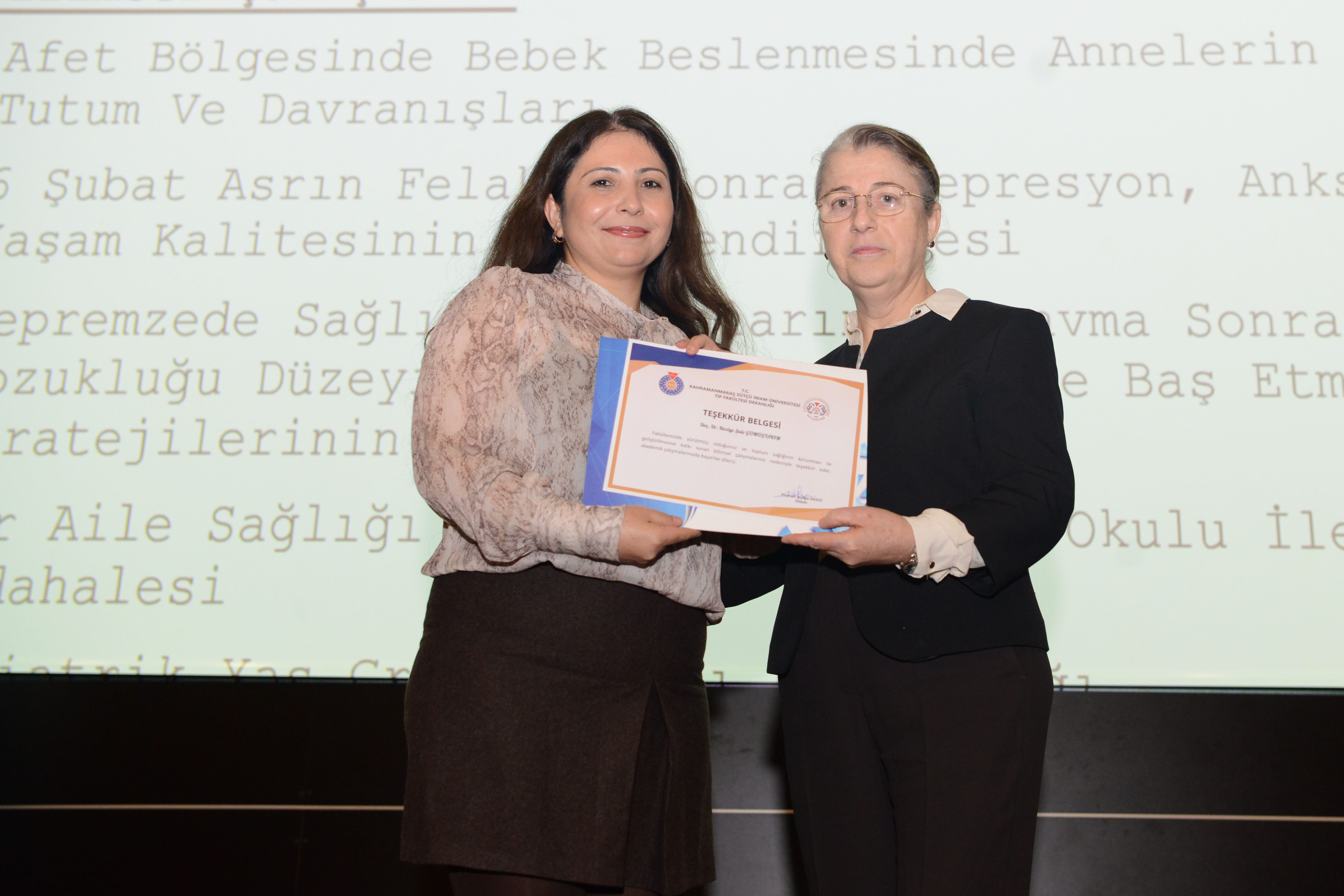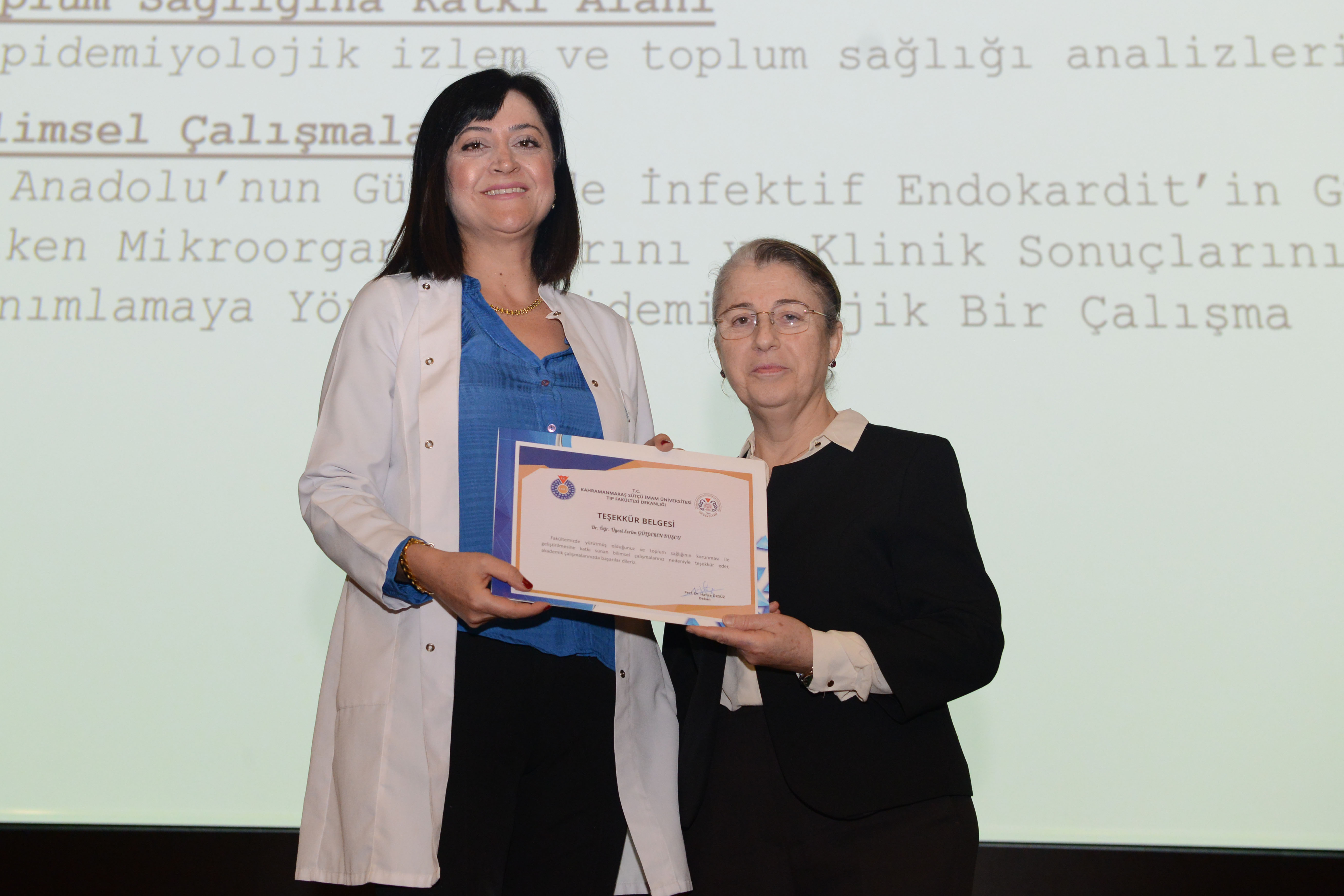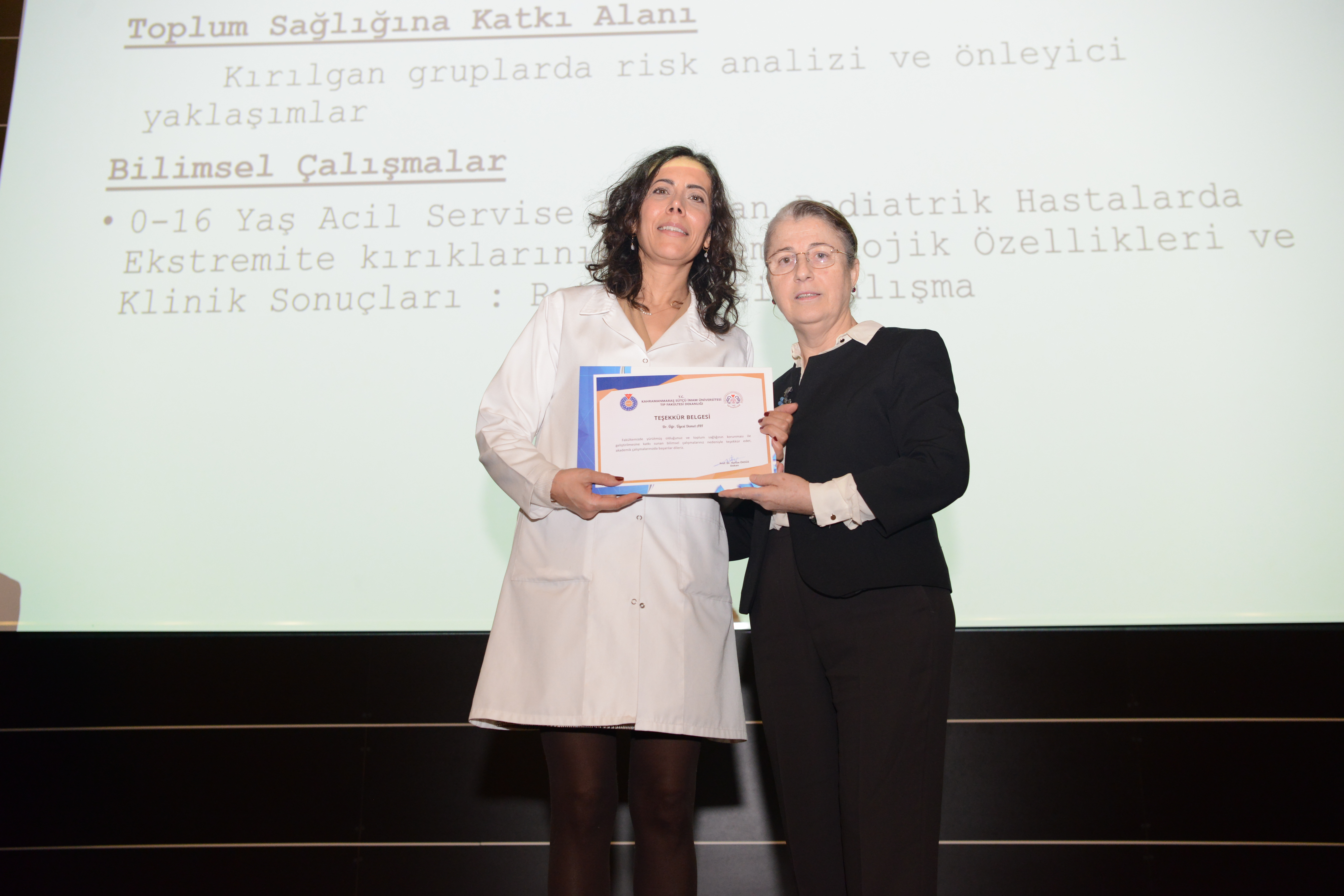 Toplam 23 öğretim üyesine ait 45 bilimsel araştırmanın yer aldığı programda teşekkür belgeleri, Tıp Fakültesi Dekanı Prof. Dr. Hafize Öksüz tarafından takdim edildi.