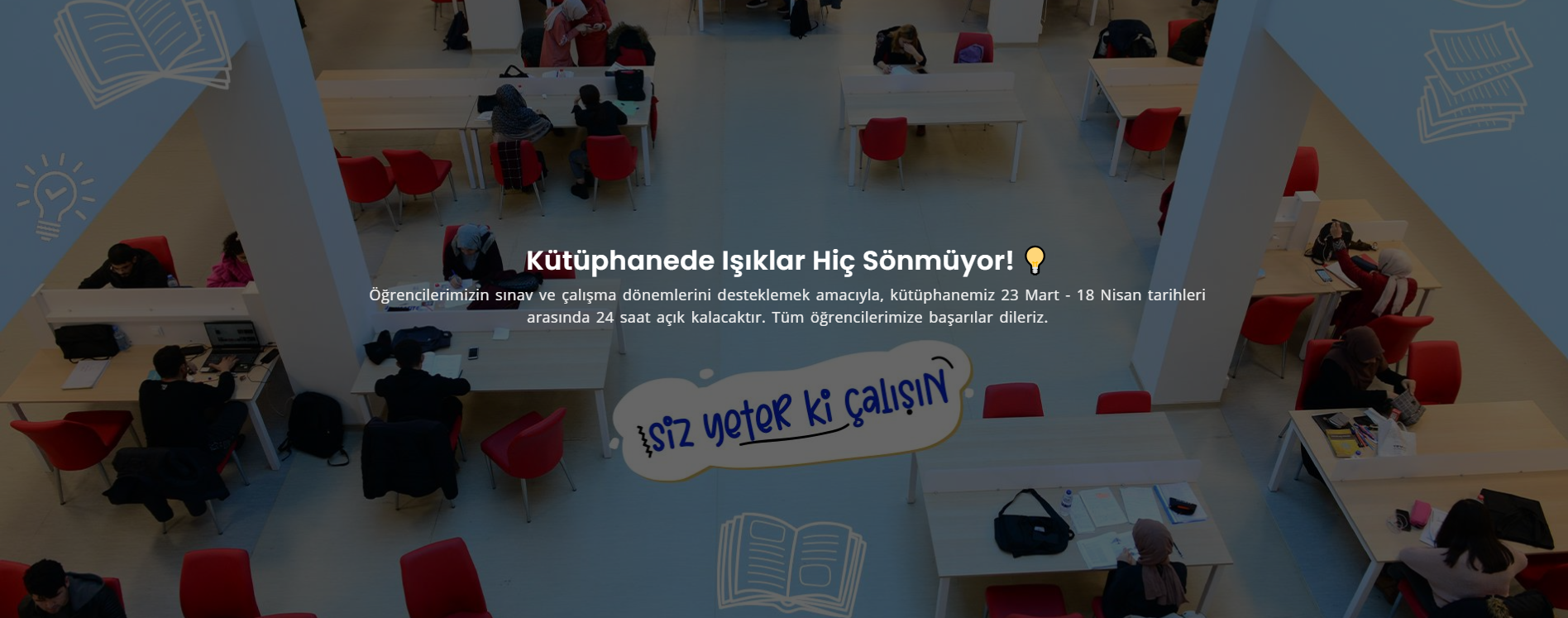 Öğrencilerimizin sınav ve çalışma dönemlerini desteklemek amacıyla, kütüphanemiz 23 Mart - 18 Nisan 2026 tarihleri arasında 24 saat açık kalacaktır.