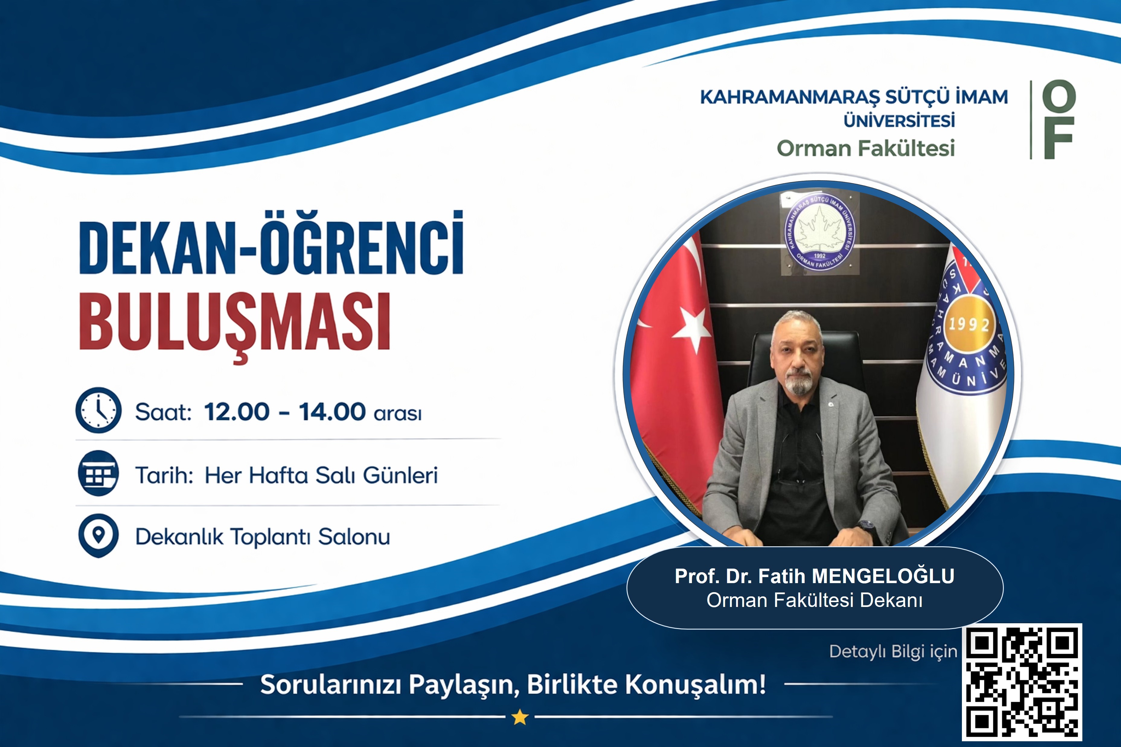 Fakültemizde, öğrencilerimiz ile yönetim arasında iletişimi güçlendirmek, görüş ve önerileri doğrudan dinlemek amacıyla her hafta Salı günleri 12.00–14.00 saatleri arasında “Dekan-Öğrenci Buluşmaları” düzenlenmektedir.