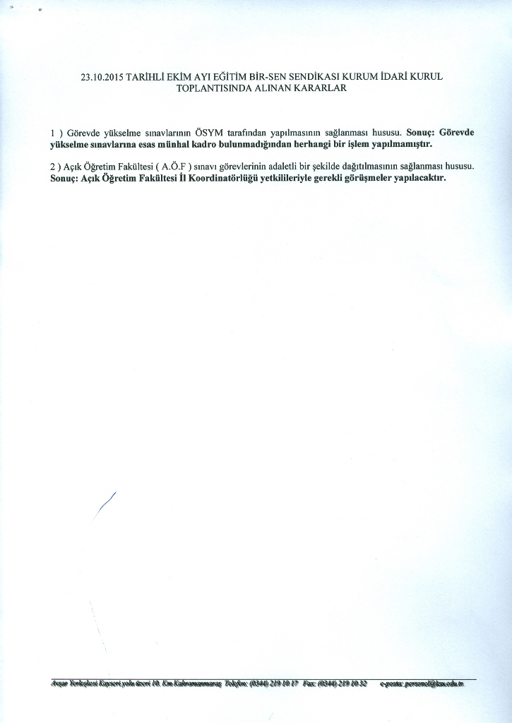 23.10.2015 Tarihli Ekim Ayı Eğitim Bir-Sen Sendikası Kurum İdari Kurul Toplantısında Alınan Kararlar