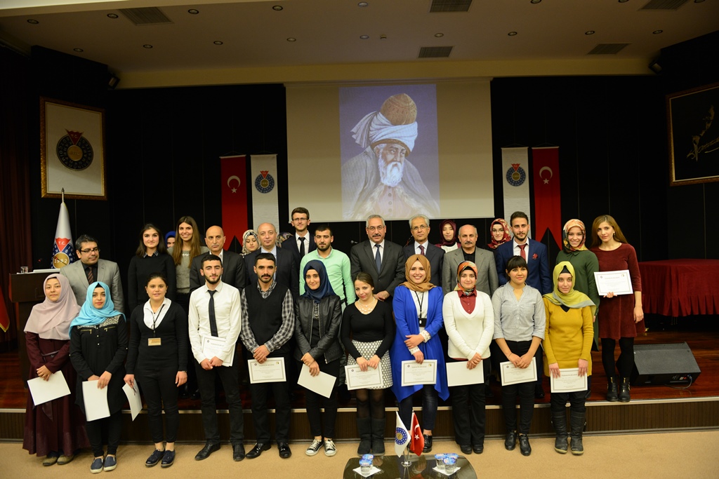 Programın sonunda üniversitemiz Rektörü Prof. Dr. Durmuş Deveci tarafından organizasyonda görev alan öğrencilere teşekkür belgeleri verildi. Teşekkür belgesi takdiminde öğrencilere seslenen Rektör Deveci, Mevlânâ’nın “Bir mum diğerini tutuşturmakla ışığından bir şey kaybetmez” sözünü hatırlatarak, “Rektör olmaya karar verdiğimde bu sözü temel almıştım. Bu gün de bu söz, benim hayatıma yön verirken örnek aldığım sözlerden biridir. Sizlere de tavsiyem ışık saçmak için yanmaktan çekinmeyin” diye konuştu.
