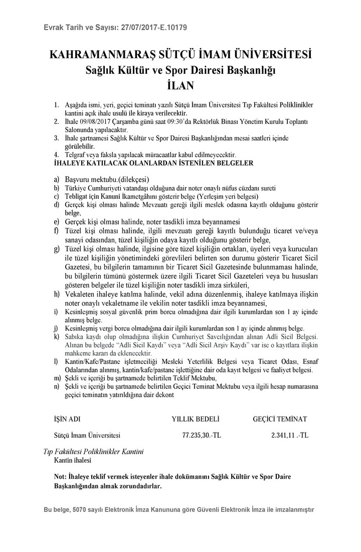 KSÜ Tıp Fakültesi Poliklinik Kantin İhalesi İlanı