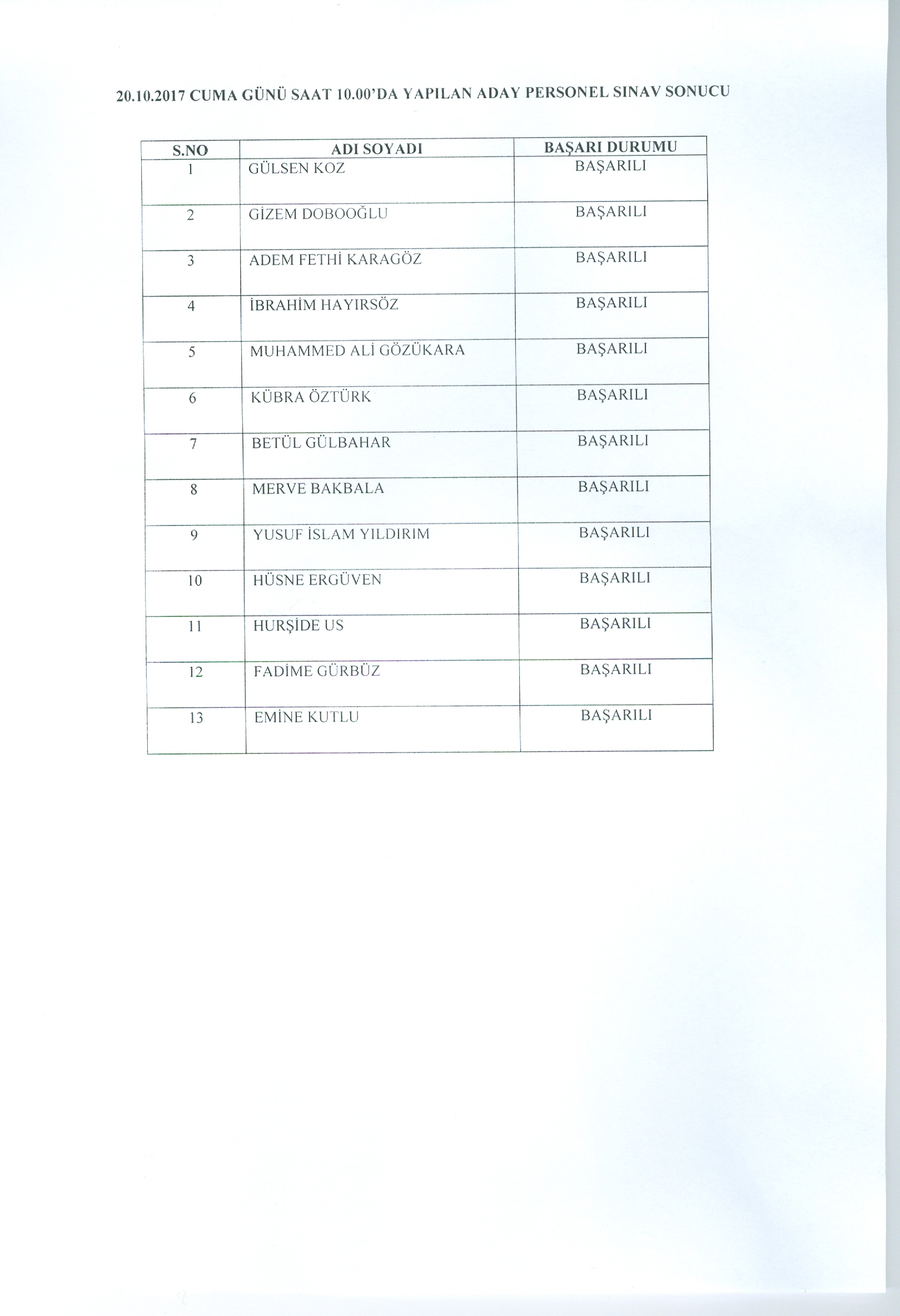21.10.2017 Cuma Günü Saat 10.00 da Yapılan Aday Personel Sınav Sonucu