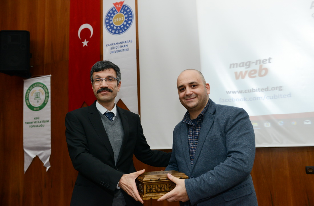 Konferans sunumunun ardından Tarım Ekonomisi Öğretim Üyesi Tarım ve İletişim Öğrenci Topluluğu Akademik Danışmanı Yrd. Doç. Dr. Mücahit Paksoy tarafından ÇUBİTED Başkan Yardımcısı Andaç Yakın’a günün anısına hediye takdim edildi.