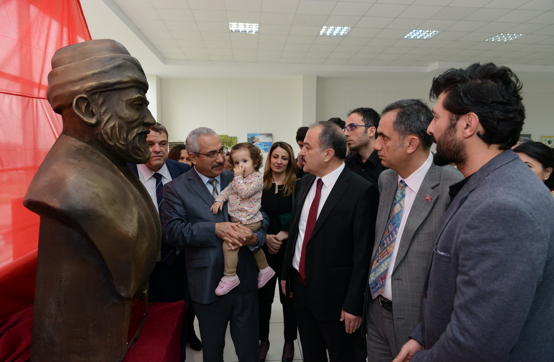 8 Mart Dünya Kadınlar Günü münasebetiyle düzenlenen sergide GSF Öğretim Görevlisi Heykeltıraş Mehmet Aksoy’un uzun süren araştırmalar ve 3 ay süren atölye çalışması sonucunda tamamladığı Kahramanmaraş Milli Mücadelesi kahramanı Sütçü İmam’ın büstü de ilk kez sanatseverlerle buluştu.