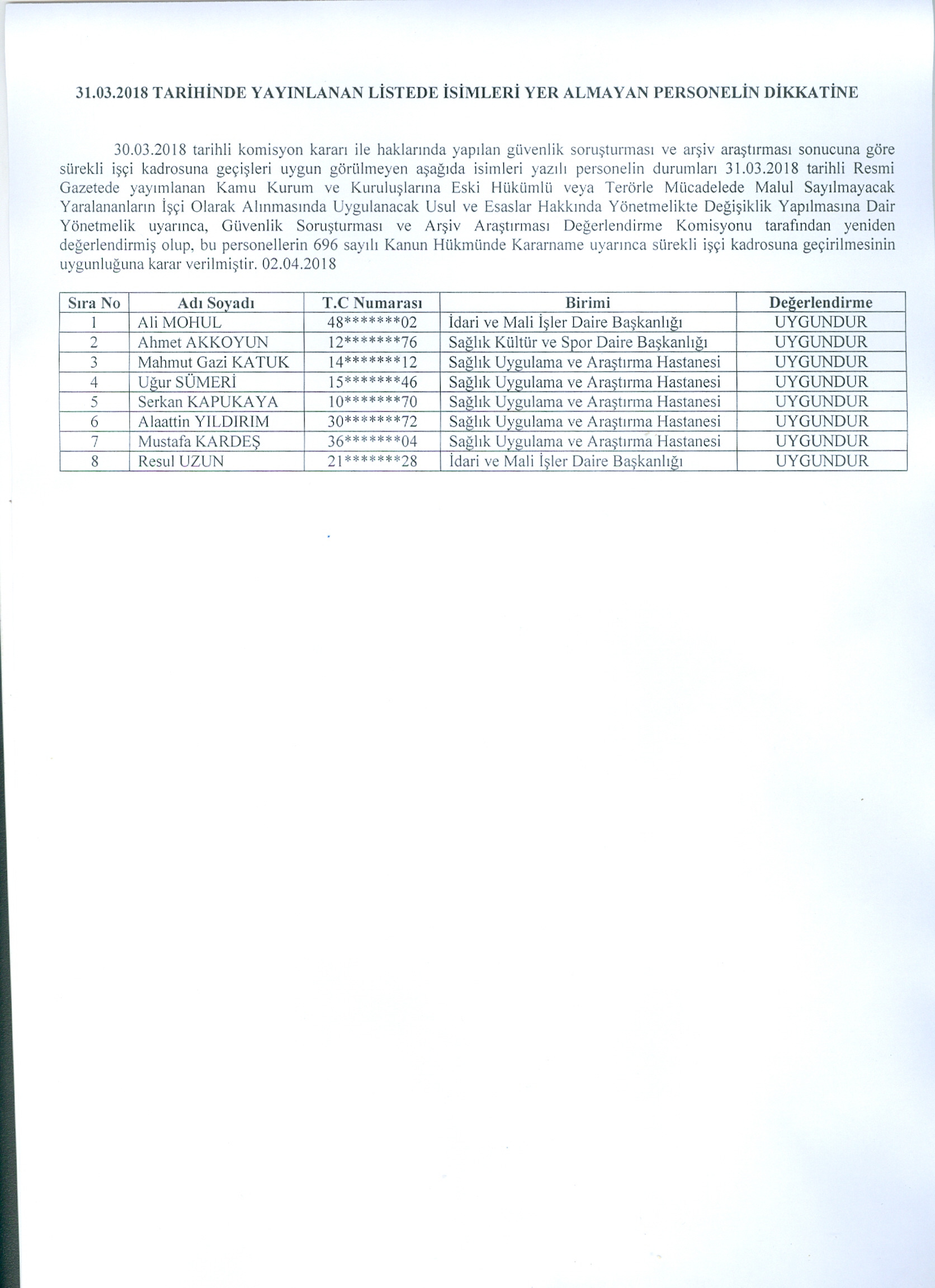 31.03.2018 TARİHİNDE YAYINLANAN LİSTEDE İSİMLERİ YER ALMAYAN PERSONELİN DİKKATİNE