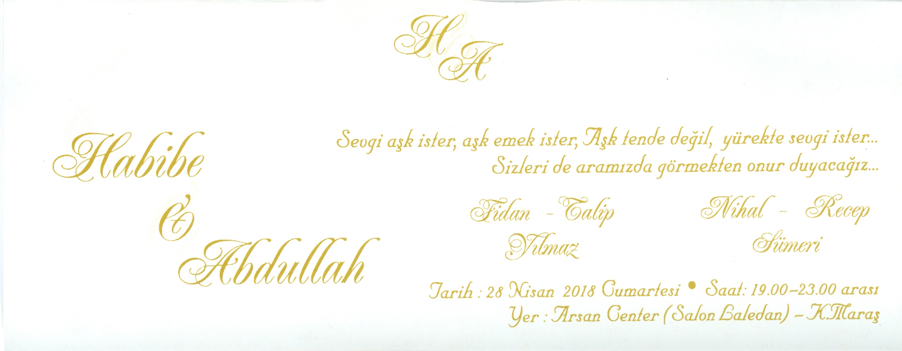 Yapı İşleri ve Teknik Daire Başkanlığı Personeli Recep SÜMERİ'nin oğlu Abdullah SÜMERİ 28 Nisan 2018 Cumartesi Saat:19.00-23.00 saatleri arasında Arsan Center Laledan Düğün Salonunda düzenlenecek törenle dünya evine girecektir. SÜMERİ ailesini ve genç çifti tebrik eder, mutluluklar dileriz.