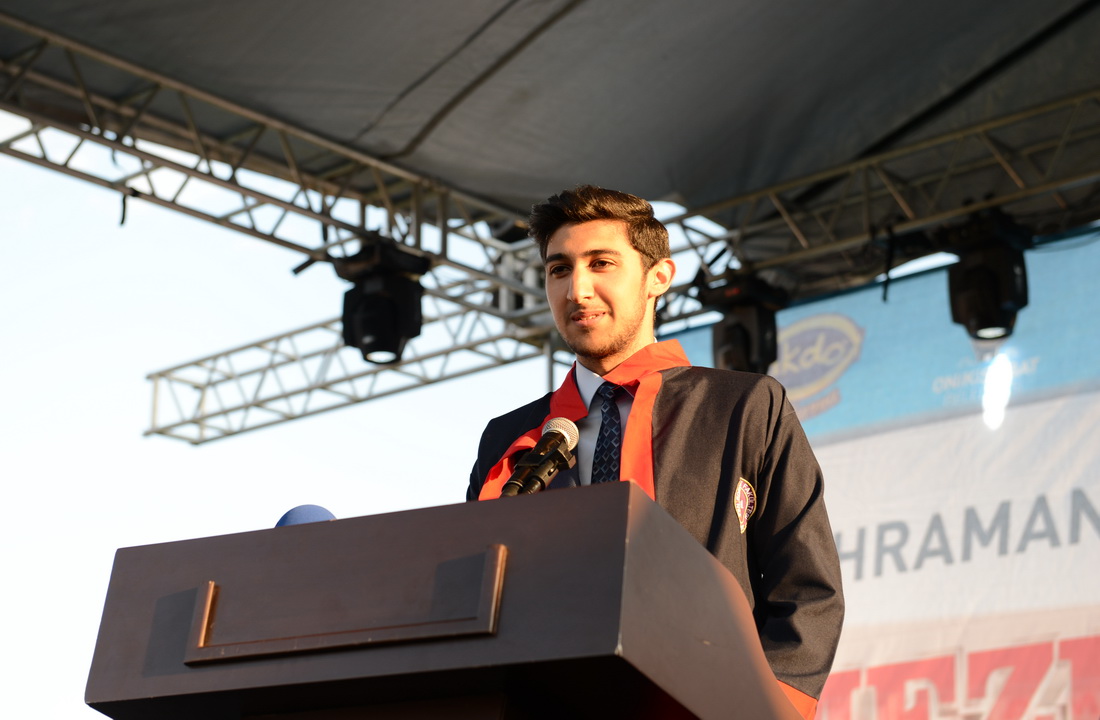 Törende Üniversitemiz Öğrenci Konseyi Başkanı Hasan Demir ve 2017-2018 mezunları adına dönem birincisi İlahiyat Fakültesi Öğrencisi Büşra Kurt da birer konuşma yaptılar.