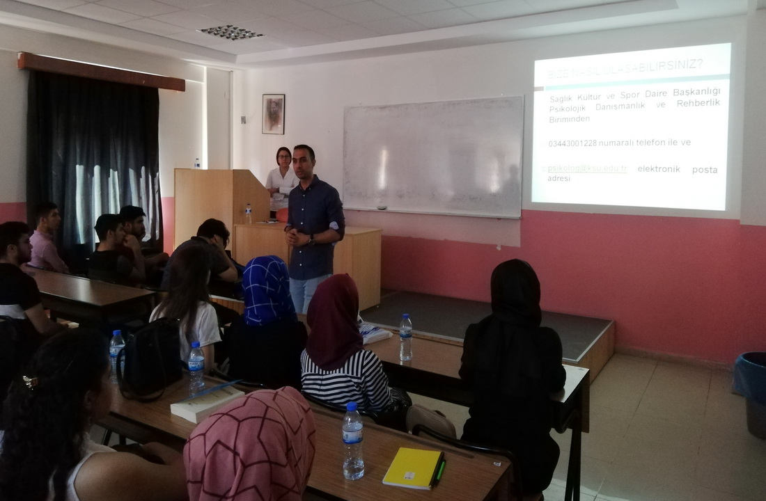 Kahramanmaraş Sütçü İmam Üniversitesi (KSÜ) Sağlık Kültür ve Spor Daire Başkanlığı Psikolojik Danışmanlık ve Rehberlik (PDR) Birimi üniversiteye yeni başlayan öğrencilere uyum eğitimleri kapsamında üniversitemiz psikologları tarafından tanıtıldı.