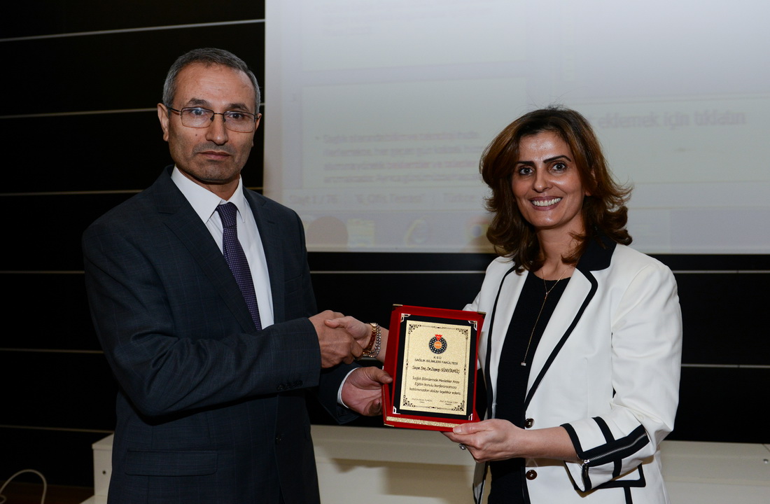 Konferans sunumunun ardından Rektör Yardımcısı Prof. Dr. Kadir Saltalı, Doç. Dr. Zeynep Güngörmüş’e konferansa katkıları için teşekkür plaketi verirken, Güngörmüş adına düzenlenen teşekkür belgesini ise Sağlık Bilimleri Fakültesi Dekanı Prof. Dr. Deniz Tuncel ve Tıp Fakültesi Dekanı Prof. Dr. Kamile Gül tarafından takdim edildi.