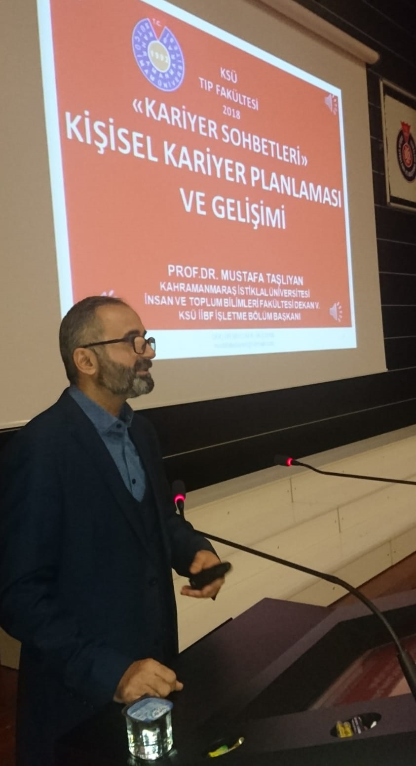 20 Aralık 2018 tarihinde saat 14.00’da Hastane Konferans Salonunda gerçekleşen programda Kahramanmaraş İstiklal Üniversitesi İnsan ve Toplum Bilimleri Fakültesi Dekan Vekili Prof.Dr. Mustafa TAŞLIYAN Kariyer Yönetimi konulu bir sunum yaptı. Yaptığı sunumda “Kişisel Kariyer Planlaması ve Gelişimi” hakkında önemli ve çarpıcı bilgiler veren TAŞLIYAN kariyer seçiminde dikkat edilmesi gereken hususlar konusunda da fakültemiz öğrencilerini bilgilendirdi.