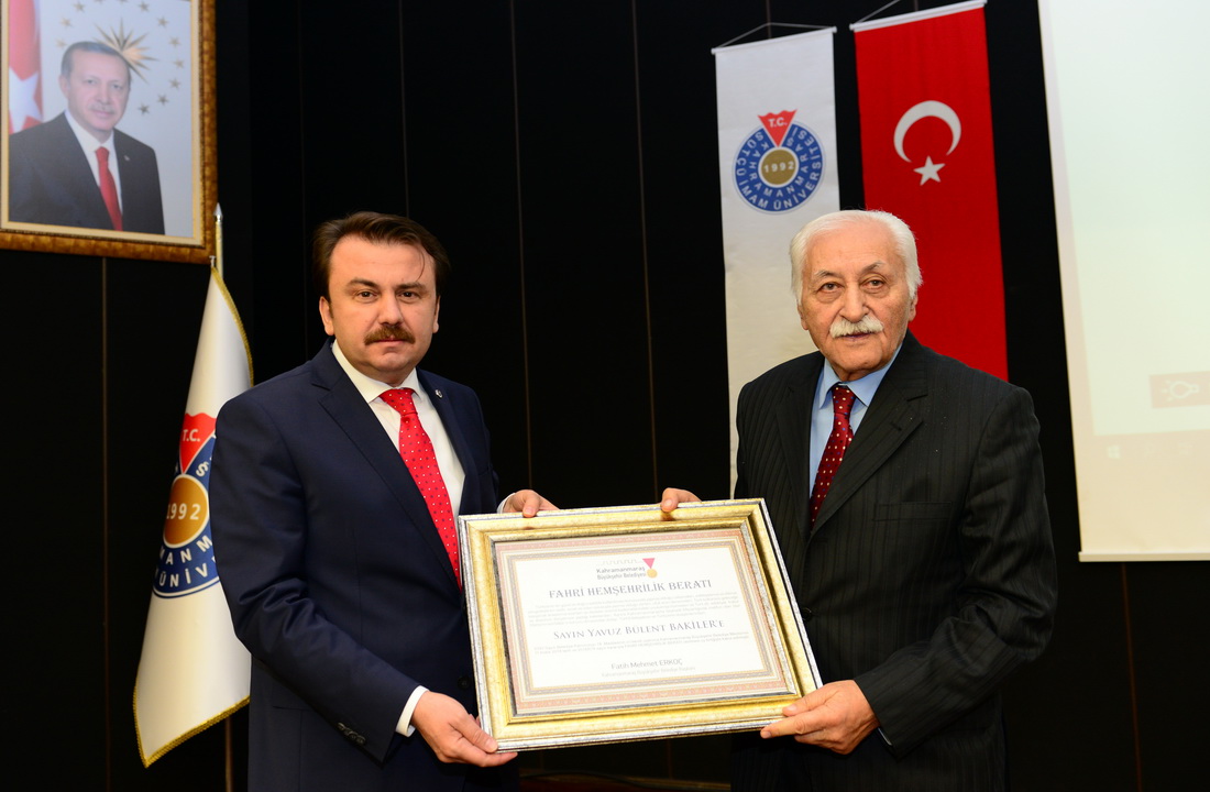 Kahramanmaraş Sütçü İmam Üniversitesi (KSÜ) Rektörlüğü ve KSÜ Dil ve Edebiyat Öğrenci Topluluğu tarafından İstiklal Şairi Mehmet Akif Ersoy’un vefatının 82. yılı münasebetiyle “Dava Adamı Mehmet Akif Ersoy” konulu konferans düzenlendi. Program kapsamında konferansa konuşmacı olarak katılan Şair-Yazar Yavuz Bülent Bakiler’e Kahramanmaraş Büyükşehir Belediye Meclisi tarafından tertip edilen ‘Fahri Hemşehrilik Beratı’ takdimi gerçekleştirildi.