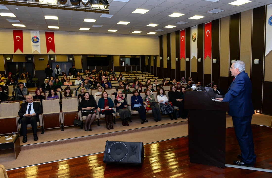 Programın açılış konuşmasını yapan Rektör Can, dinimizin ve kültürümüzün insana ve özellikle kadına verdiği öneme dikkat çekti. “Kadınlar her alanda güzelliğin, naifliğin ve nezaketin sembolüdür.” diyen Rektör Can, kadının özellikle anne olma vasfıyla toplumların şekillenmesi inşası ve ihyasında çok önemli bir role sahip olduğunun altını çizdi.