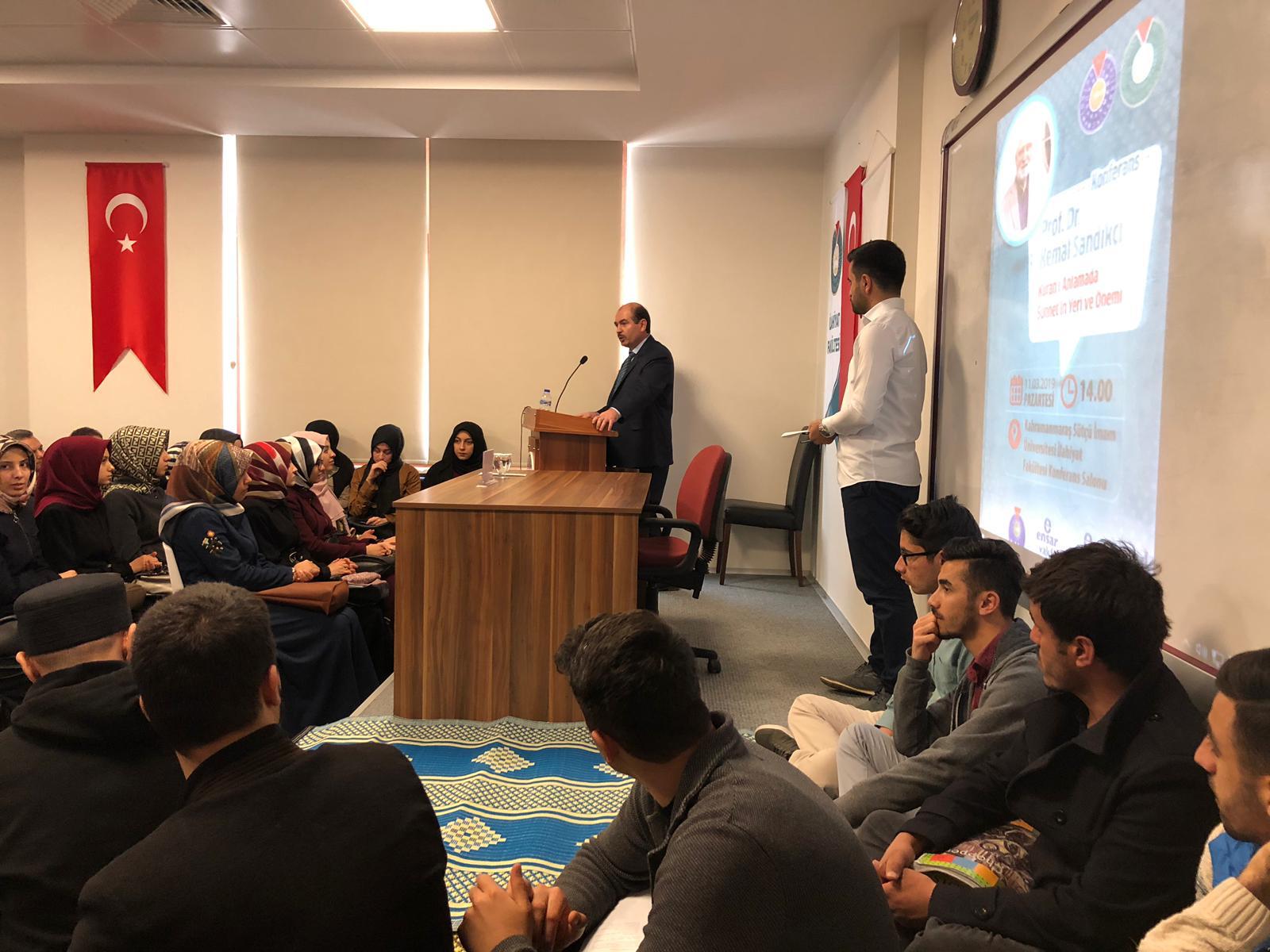 Konuşmacı olarak Fakültemizi onurlandıran Prof. Dr. Kemal SANDIKÇI Hocamız “Kur’an’ı Anlamada Sünnet’ in Yeri ve Önemi” konuları üzerine öğrencilerimize bilgi vererek konferansını gerçekleştirdi.
