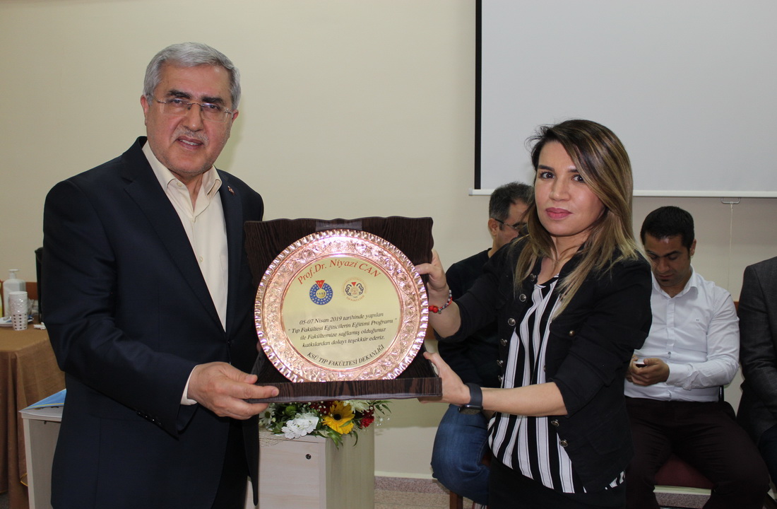 Tıp Fakültesi Dekanı Prof. Dr. Kamile Gül tarafından Rektör Prof. Dr. Niyazi Can’a programın gerçekleştirilmesine sunduğu katkılardan ötürü teşekkür plaketi takdim edildi.
