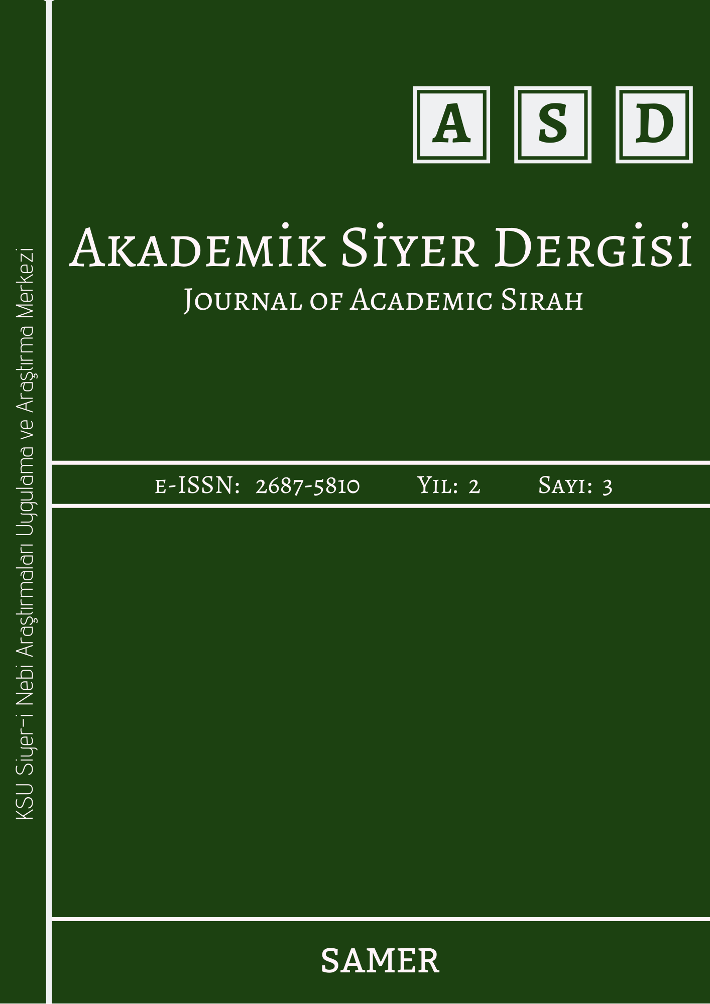 Ülkemizin bir üniversiteye bağlı olarak yayımlanan tek siyer dergisi Akademik Siyer Dergisi’nin 3. sayısı 1 Ocak 2021 tarihinde yayımlandı. İkinci sayısından itibaren Index Islamicus’ta taranarak uluslararası dergi statüsüne geçen Akademik Siyer Dergisi, bu sayısında siyer alanında 5 özgün makale, 1 çeviri ve 1 kitap değerlendirmesine yer verdi. Editörlüğünü SAMER Müdür Yardımcısı Doç. Dr. Feyza Betül Köse’nin yürüttüğü Akademik Siyer Dergisi, daha fazla sayıda uluslararası saygın alan indekslerinde taranarak ülkemizin akademik birikimini uluslararası bilim çevrelerine sunmayı hedefliyor.