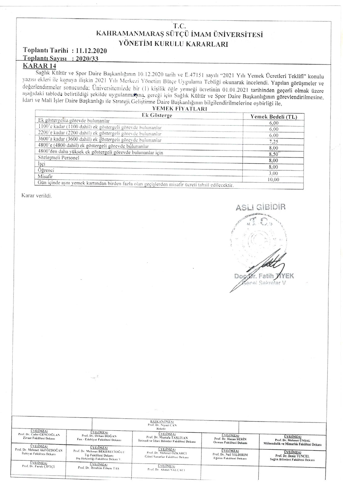 KSÜ Yönetim Kurulunun 11.12.2020 tarihinde almış olduğu 01.01.2021 tarihinden itibaren geçerli olan KSÜ yemek ücretleri aşağıdaki gibidir.