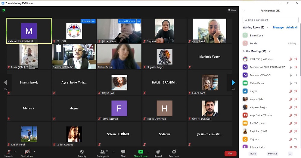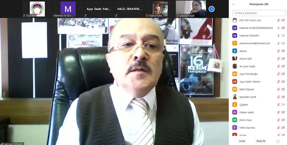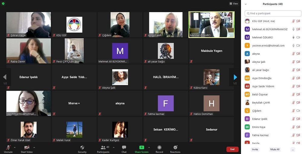 Kahramanmaraş Sütçü İmam Üniversitesi Güzel Sanatlar Fakültesi Dekanı Prof. Dr. Mehmet ÖZKARCI, Öğretim Elemanları ve Resim Bölümü öğrencilerinin katılımıyla, 2020-2021 Eğitim-Öğretim yılı Bahar yarıyılının ilk toplantısı, 2 Mart 2021 Salı günü saat 12:00’de ZOOM üzerinden gerçekleştirildi. Dekan ÖZKARCI, öğrencilere sürecin nasıl ilerlediğini, yapılan derslerde sıkıntı yaşayıp yaşamadıklarını sordu. Öğrenciler yapılan derslerde hiçbir sıkıntı yaşamadıklarını ancak hocalarını ve üniversiteyi özlediklerini dile getirdiler. Öğrenciler bir araya gelmekten çok mutlu oldukları ifade ettiler. Dekan ÖZKARCI, öğrencilerimizle online üzerinden sohbet programlarının devam edeceğini belirterek, programa katılan hocalara ve öğrencilere teşekkür etti.