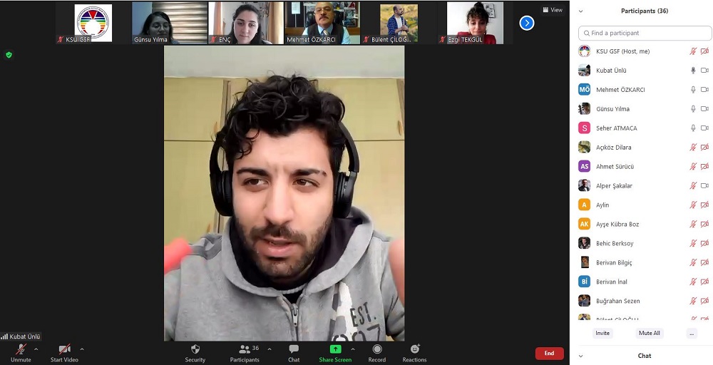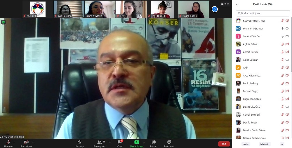 Kahramanmaraş Sütçü İmam Üniversitesi Güzel Sanatlar Fakültesi Dekanı Prof. Dr. Mehmet ÖZKARCI, Öğretim Elemanları ve Müzik Bölümü öğrencilerinin katılımıyla, 2020-2021 Eğitim-Öğretim yılı Bahar yarıyılının ilk toplantısı, 3 Mart 2021 Çarşamba günü saat 12:00’de ZOOM üzerinden gerçekleştirildi. Dekan ÖZKARCI, öğrencilere sürecin nasıl ilerlediğini, yapılan derslerde sıkıntı yaşayıp yaşamadıklarını sordu. Öğrenciler yapılan derslerde hiçbir sıkıntı yaşamadıklarını ancak hocalarını ve üniversiteyi özlediklerini dile getirdiler. Öğrenciler bir araya gelmekten çok mutlu oldukları ifade ettiler. Dekan ÖZKARCI, öğrencilerimizle online üzerinden sohbet programlarının devam edeceğini belirterek, programa katılan hocalara ve öğrencilere teşekkür etti.