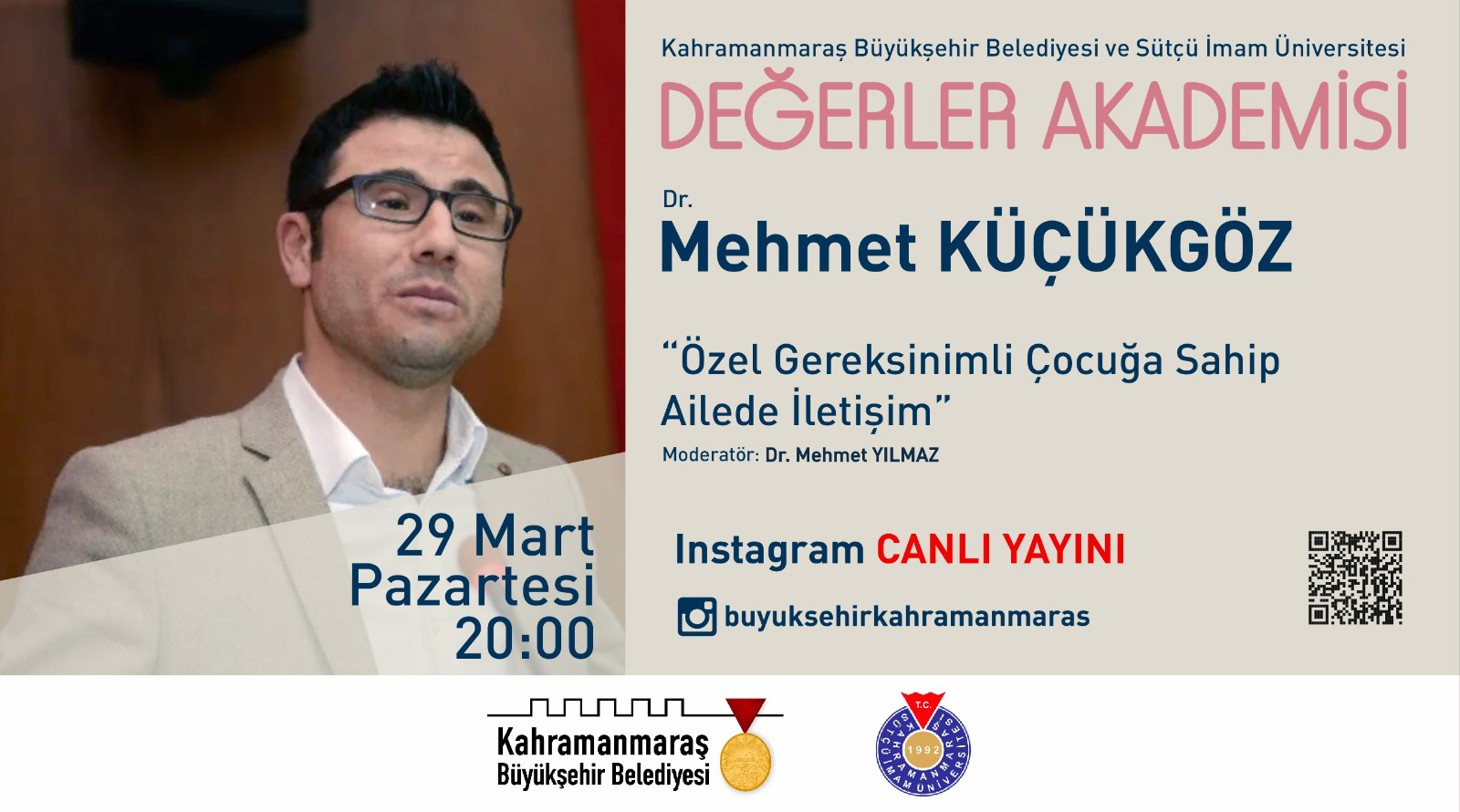 Kahramanmaraş Sütçü İmam Üniversitesi İİBF Sosyal Hizmet Bölümü ve Kahramanmaraş Büyükşehir Belediyesi Sağlık ve Sosyal Hizmetler Daire Başkanlığı Kadın ve Aile Şube Müdürlüğü ortaklığında ailenin güçlendirilmesi, ailede sorunların azaltılması ve kadına yönelik şiddet konusunda farkındalık oluşturmak amacıyla aileyi ilgilendiren önemli başlıklarda sosyal medya üzerinden "Değerler Akademisi Seminerleri" düzenlenecektir.