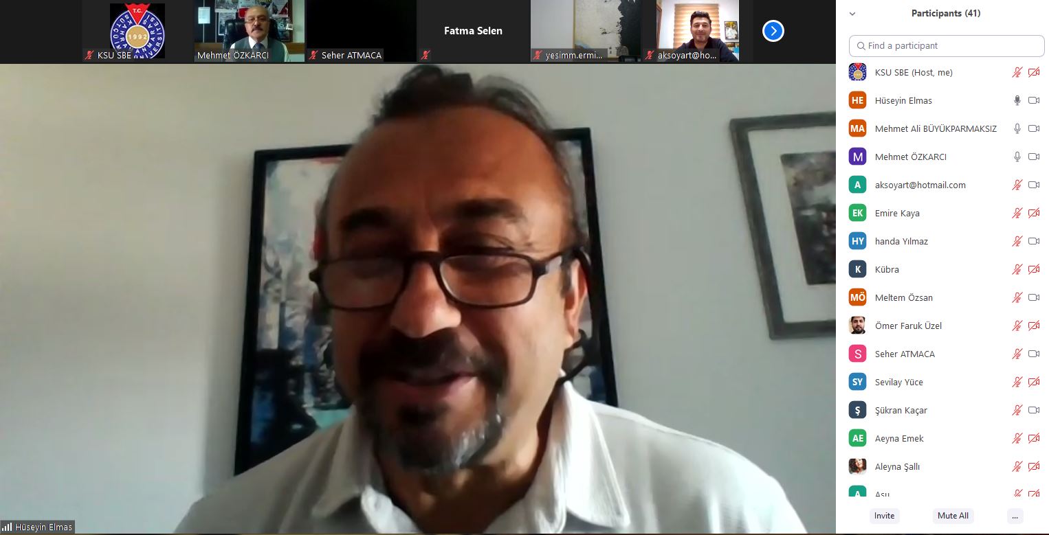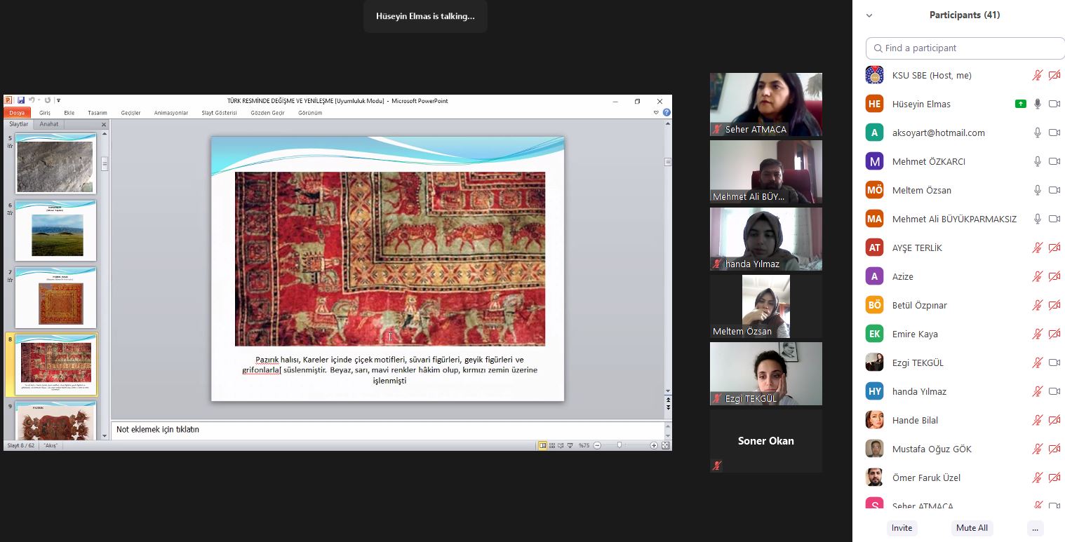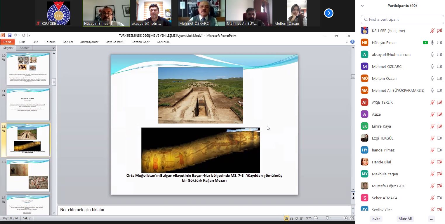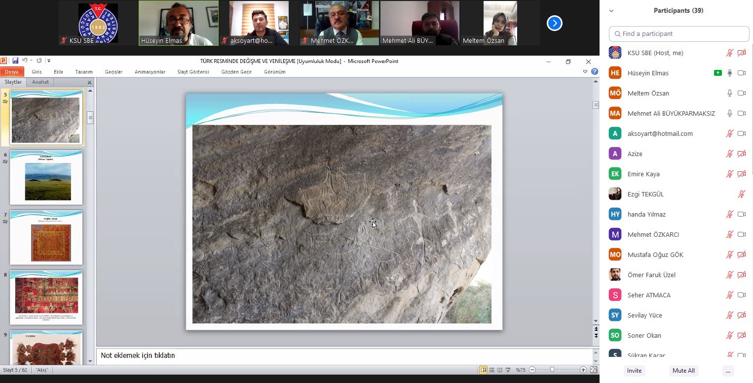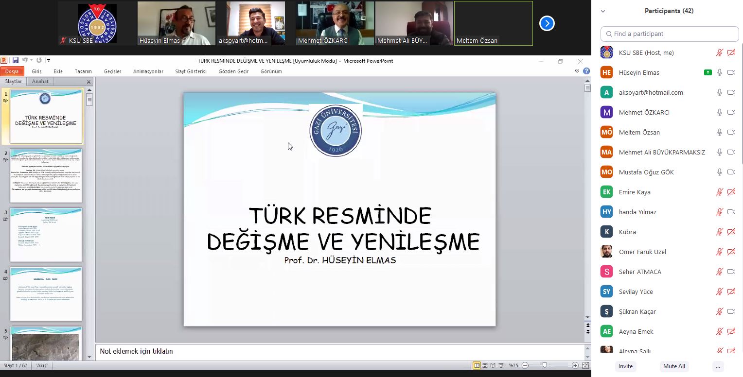 Kahramanmaraş Sütçü İmam Üniversitesi Güzel Sanatlar Fakültesi olarak “Türk Resminde Değişme Ve Yenileşme” konulu online konferans 25 Mart 2021 Perşembe günü saat: 14:00’da gerçekleştirildi. Konferansın konuşmacısı Gazi Üniversitesi, Eğitim Fakültesi, Resim-İş Eğitimi Anabilim Dalı öğretim üyesi Prof. Dr. Hüseyin ELMAS,konferansın moderatörlüğünü ise Güzel Sanatlar Fakültesi Dekanı Prof. Dr. Mehmet ÖZKARCI yaptı. Online konferansa öğretim elemanları ve öğrencilerin yanı sıra pek çok misafir katıldı. Konferansın sonunda katılımcıların sorularını cevaplayan Prof. Dr. Hüseyin ELMAS, bu nazik davet için Dekanı Prof. Dr. Mehmet ÖZKARCI’ya teşekkür etti.