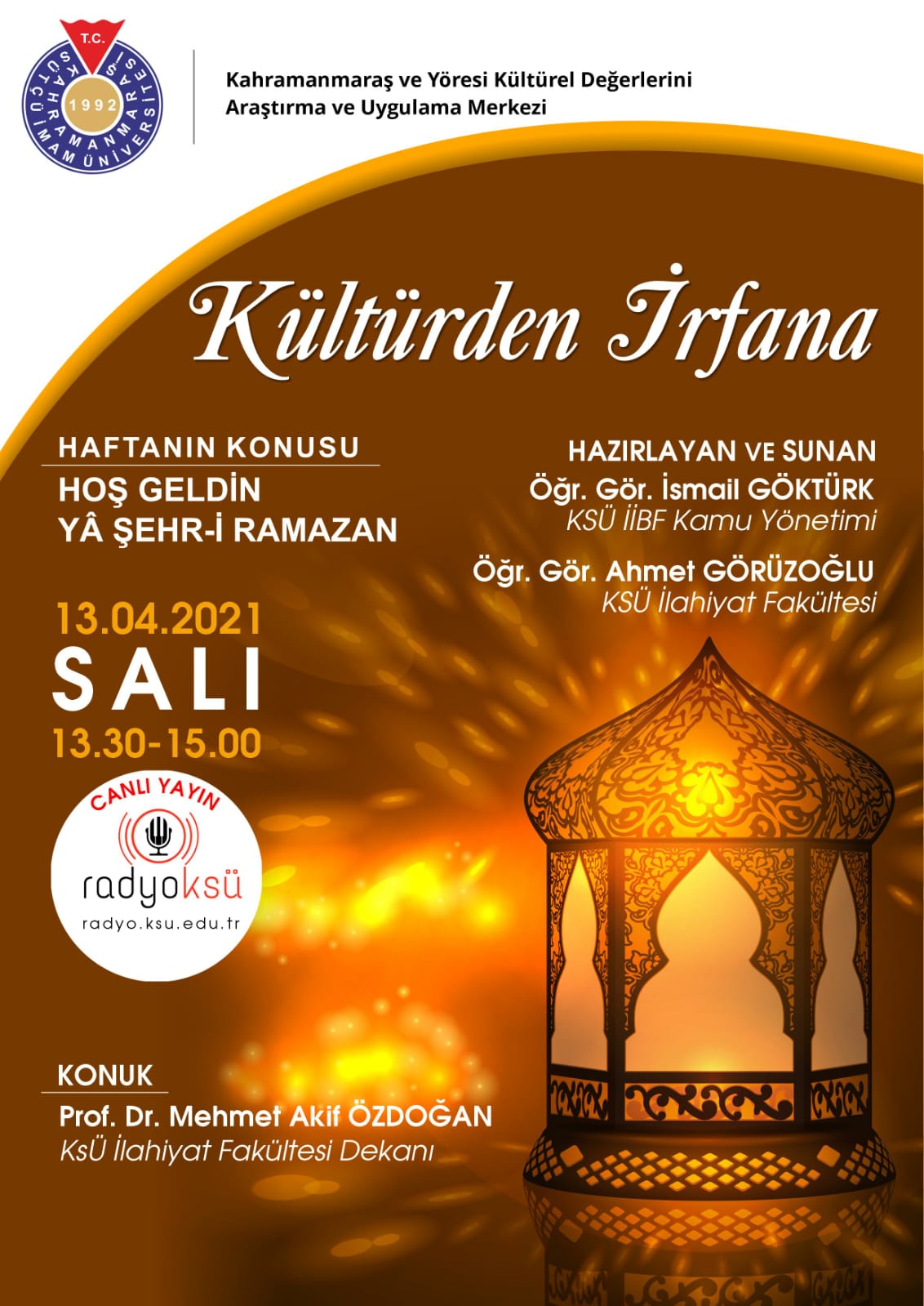 Radyoksü de, Bugün 13:30-15:00 saatleri arası Kültürden İrfana Programının Konuğu 'Haftanın Konusu Hoş Geldin Ya Şehr-i Ramazan' İle Dekanımız Prof Dr. Mehmet Akif ÖZDOĞAN