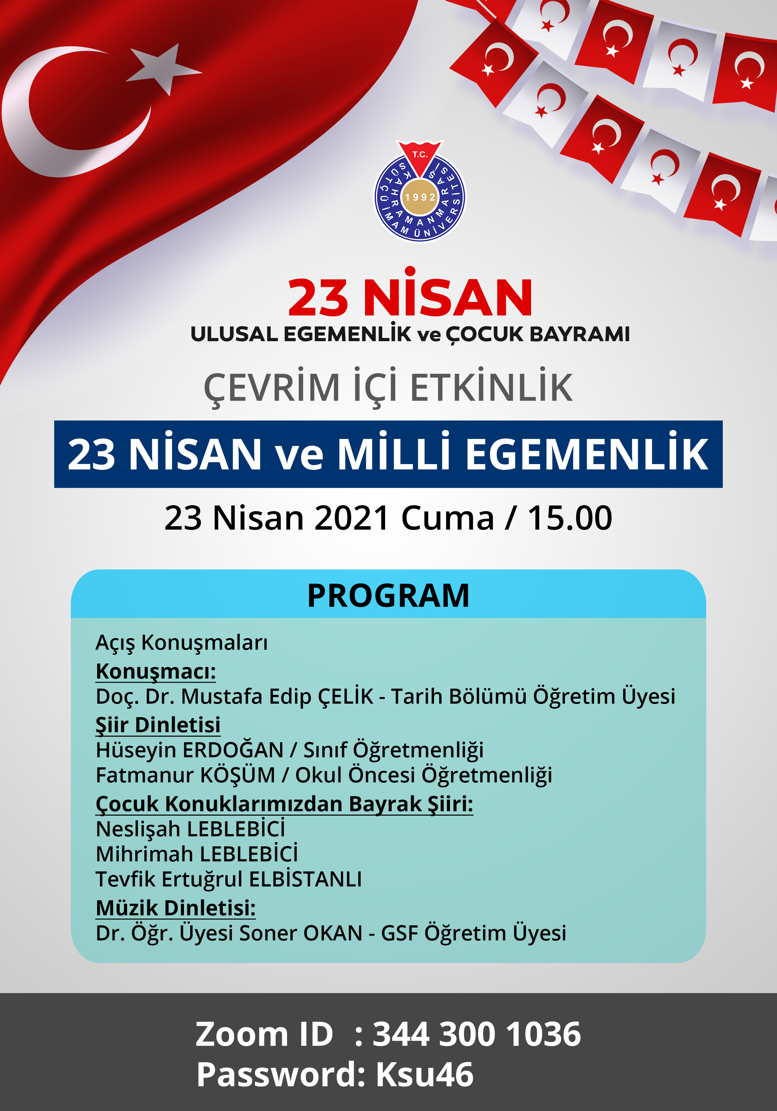 Kahramanmaraş Sütçü İmam Üniversitesi (KSÜ) Rektörlüğü tarafından Türkiye Büyük Millet Meclisinin kuruluşunun 101. yılı dönümünde, 23 Nisan Ulusal Egemenlik ve Çocuk Bayramı münasebetiyle “23 Nisan ve Milli Egemenlik” konulu çevrim içi etkinlik gerçekleştirildi.
