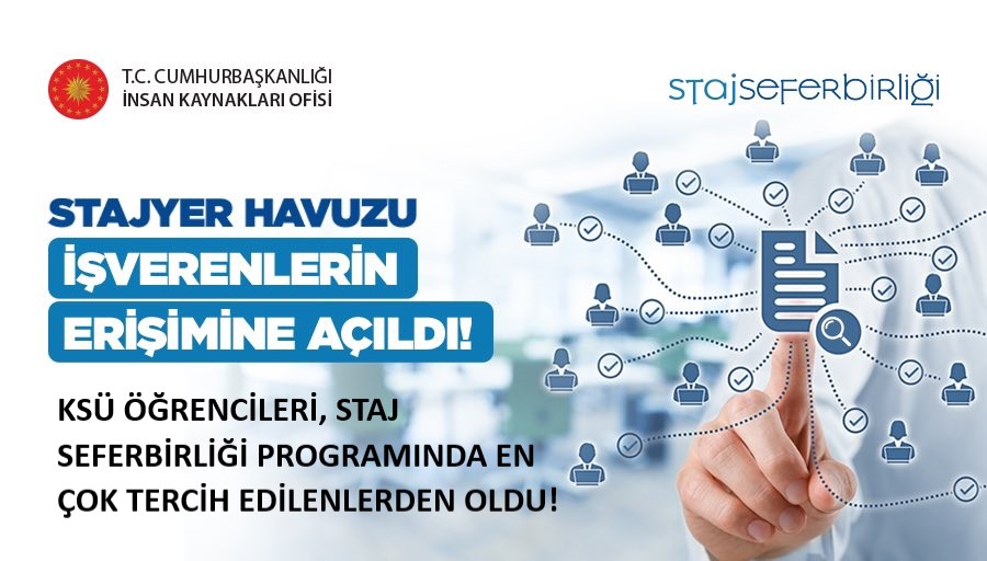 Staj Seferbirliği Programında, stajyer havuzu #StajSeferbirliği’ne katılan kamu ve özel sektörden işverenlerin erişimine açıldı. Türkiye çapında Staj Seferbirliği Programına en çok başvuruda bulunan üniversiteler arasında yer alan KSÜ öğrencileri, işverenlerden staj teklifi alma konusunda da en çok tercih edilenlerden oldu. Programın henüz daha başında öğrencilerimize işverenlerden 77 staj teklifi geldi. Programa başvuruda bulunan değerli öğrencilerimiz, http://kariyerkapisi.cbiko.gov.tr ’yi takipte kalın!