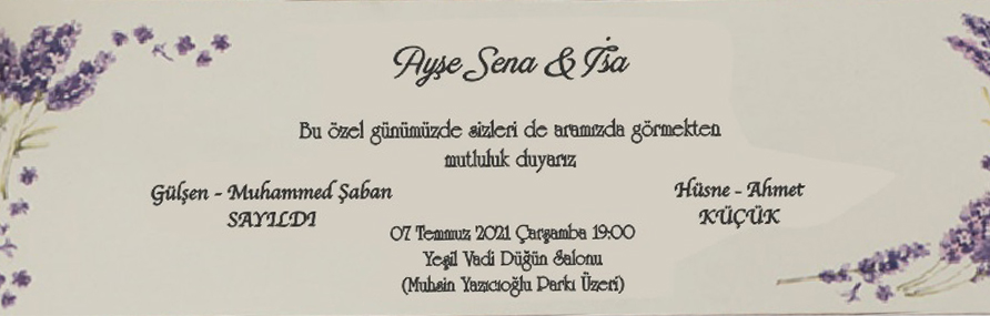 Mühendislik ve Mimarlık Fakültesi Fakülte Sekreteri Şaban SAYILDI' nın kızı Ayşe Sena 07 Temmuz 2021 Çarşamba günü saat 19.00'da Yeşil Vadi Düğün Salonunda düzenlenecek törenle dünya evine girecektir. SAYILDI ailesini ve genç çifti tebrik eder, mutluluklar dileriz.