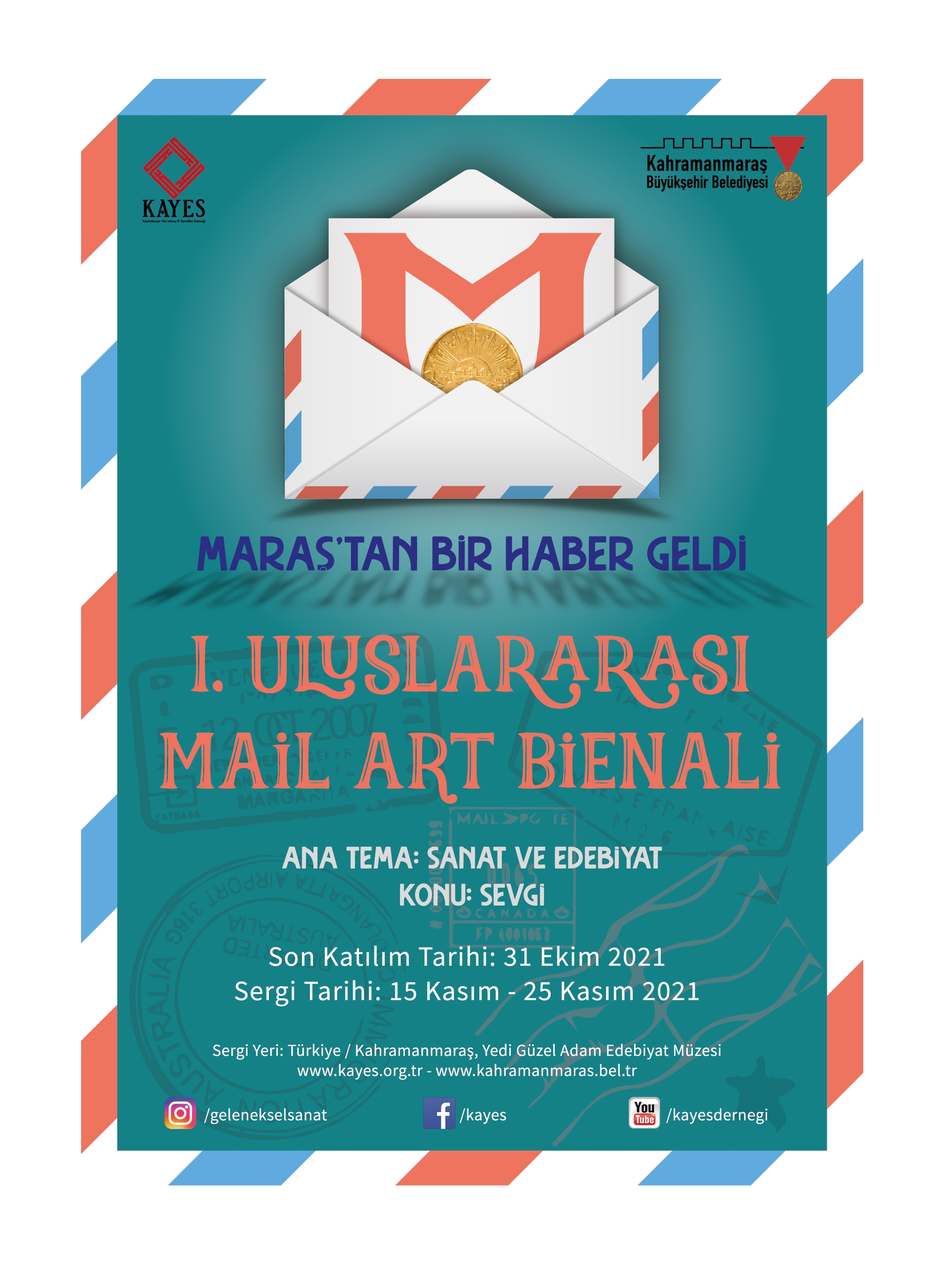 Kahramanmaraş Büyükşehir Belediyesi ve KAYES (Kaybolmaya Yüz Tutmuş El Sanatları Derneği) iş birliğinde 15-25 Kasım 2021 tarihleri arasında ekli program çerçevesinde “Maraş'tan Bir Haber Geldi 1.Uluslararası Mail Art Bienali” gerçekleştirilecektir.