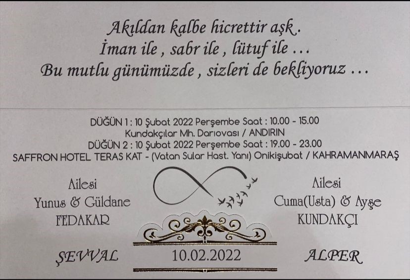 Üniversitemiz Teknik Bilimler Meslek Yüksekokulu personeli Yunus FADAKAR'ın kızı 10.02.2022 Perşembe günü 19-23.00 saatleri arasında Saffron Hotel Teras Kat Düğün Salonunda (Vatan Sular Hastanesi Yanı) düzenlenen törenle dünya evine girecektir. Genç çifti tebrik eder, mutluluklar dileriz.