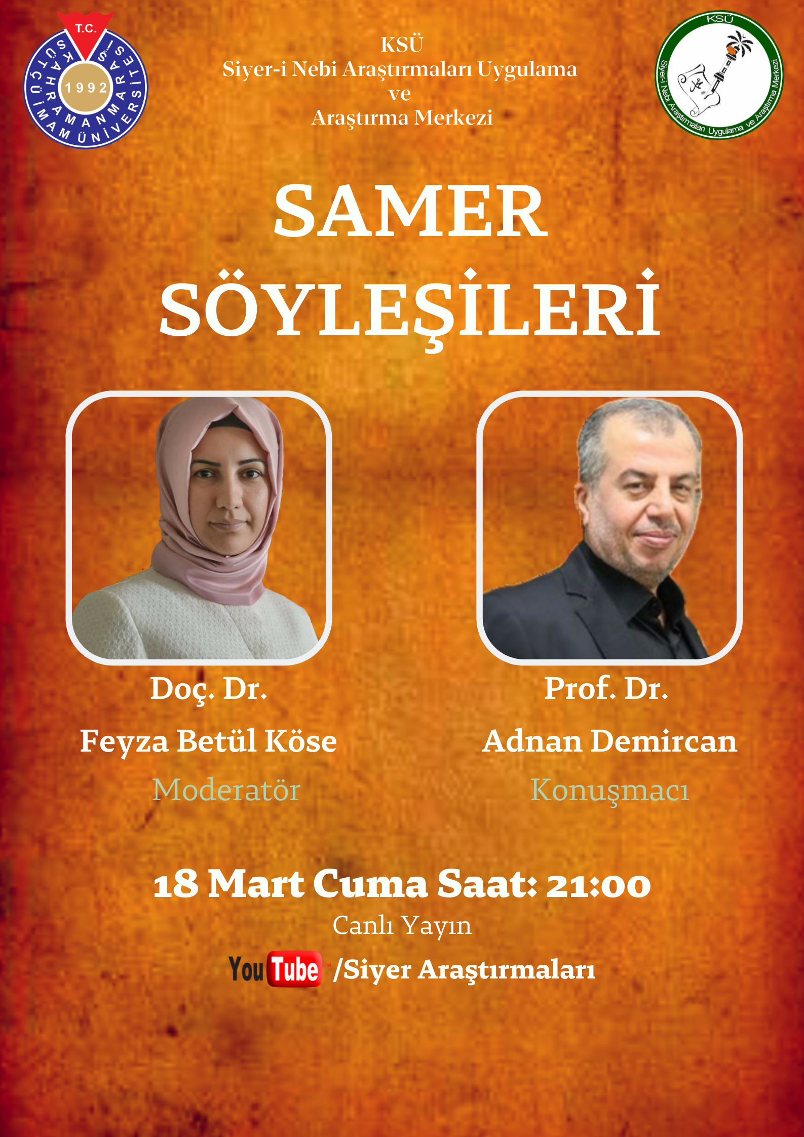 SAMER Söyleşilerinin ilkinde SAMER Müdür Yardımcısı Doç. Dr. Feyza Betül Köse, İstanbul Üniversitesi İlahiyat Fakültesi öğretim üyesi Prof. Dr. Adnan Demircan'ı konuk edecek. Söyleşi, 18 Mart Cuma saat 21:00'de canlı yayımlanacak program Youtube https://www.youtube.com/channel/UCZHl5z169dC1vR7Iabu_PvQ adresinden izlenebilecek.