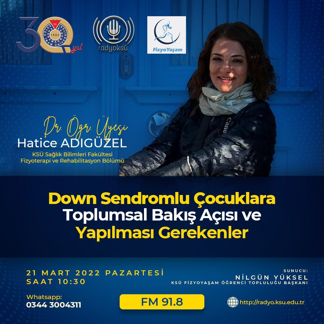Fakültemiz Fizyoterapi ve Rehabilitasyon Bölümü Öğretim Üyesi Dr. Öğr. Üyesi Hatice ADIGÜZEL, Radyo KSÜ'de "DOWN Sendromlu Çocuklara Toplumsal Bakış Açısı ve Yapılması Gerekenler" konulu program düzenleyecektir.