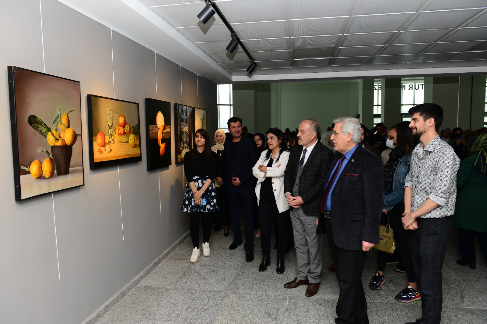 GSF Dr. Öğretim Üyesi Mehmet Aksoy koordinesinde 3. sınıf öğrencilerinin Temel Sanat Atölyesi çalışmalarından oluşan resimlerin yer aldığı sergiyi gezen Rektör Can, eser sahiplerinden çalışmalara ilişkin bilgi aldı.