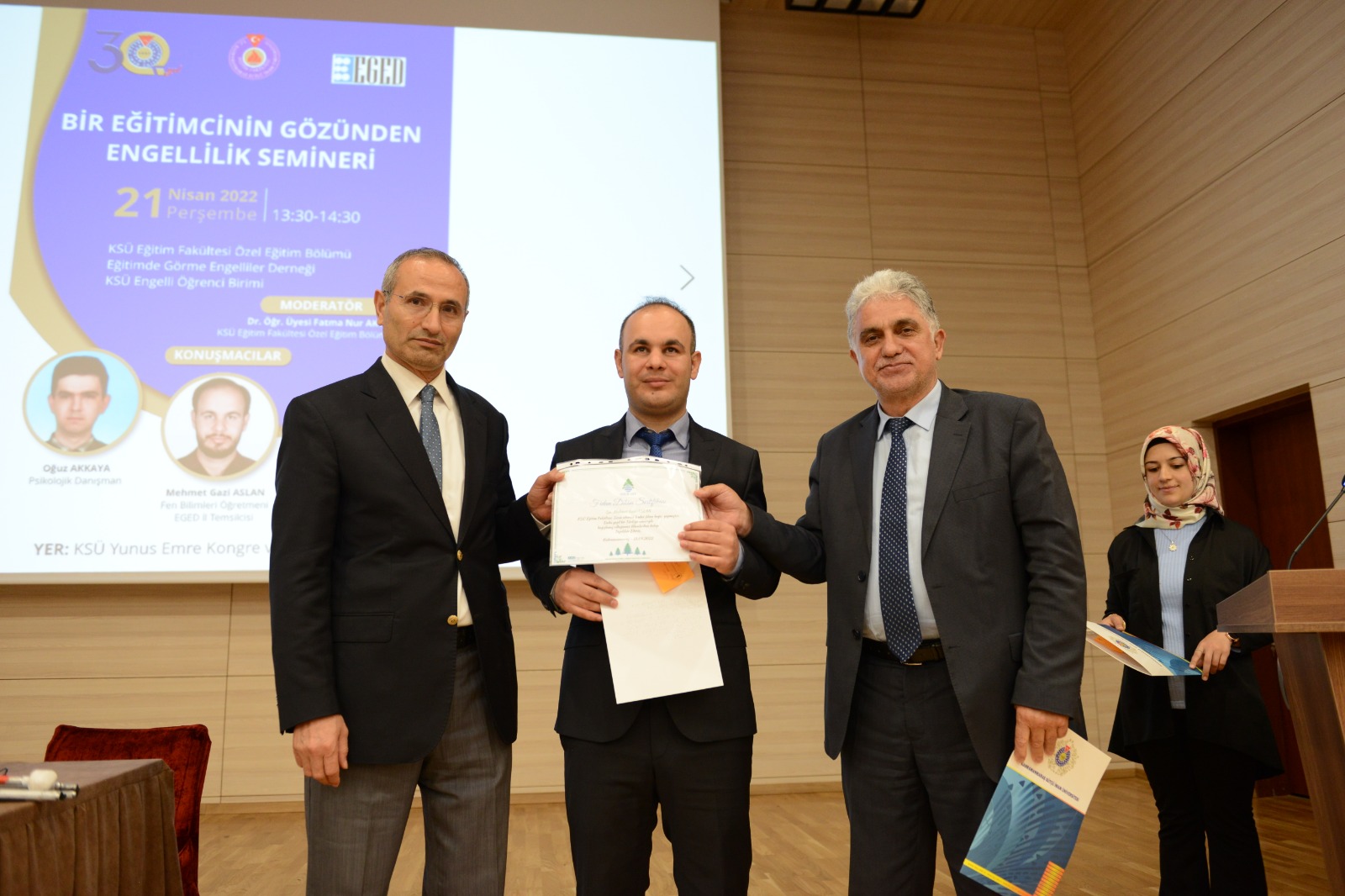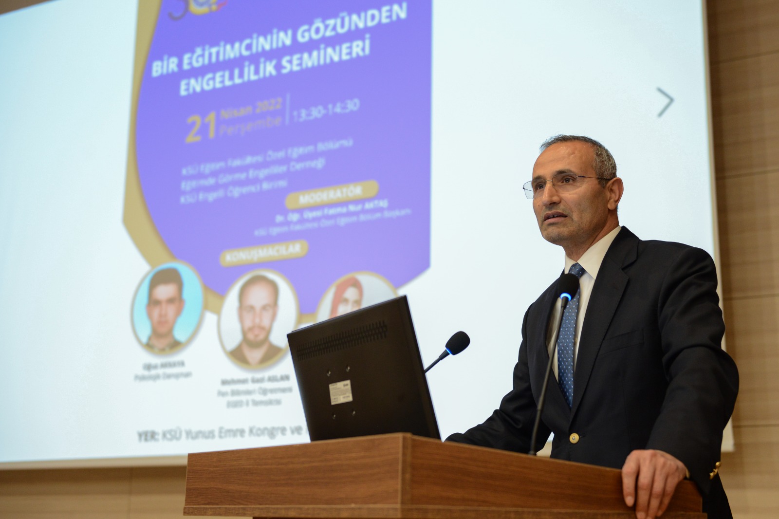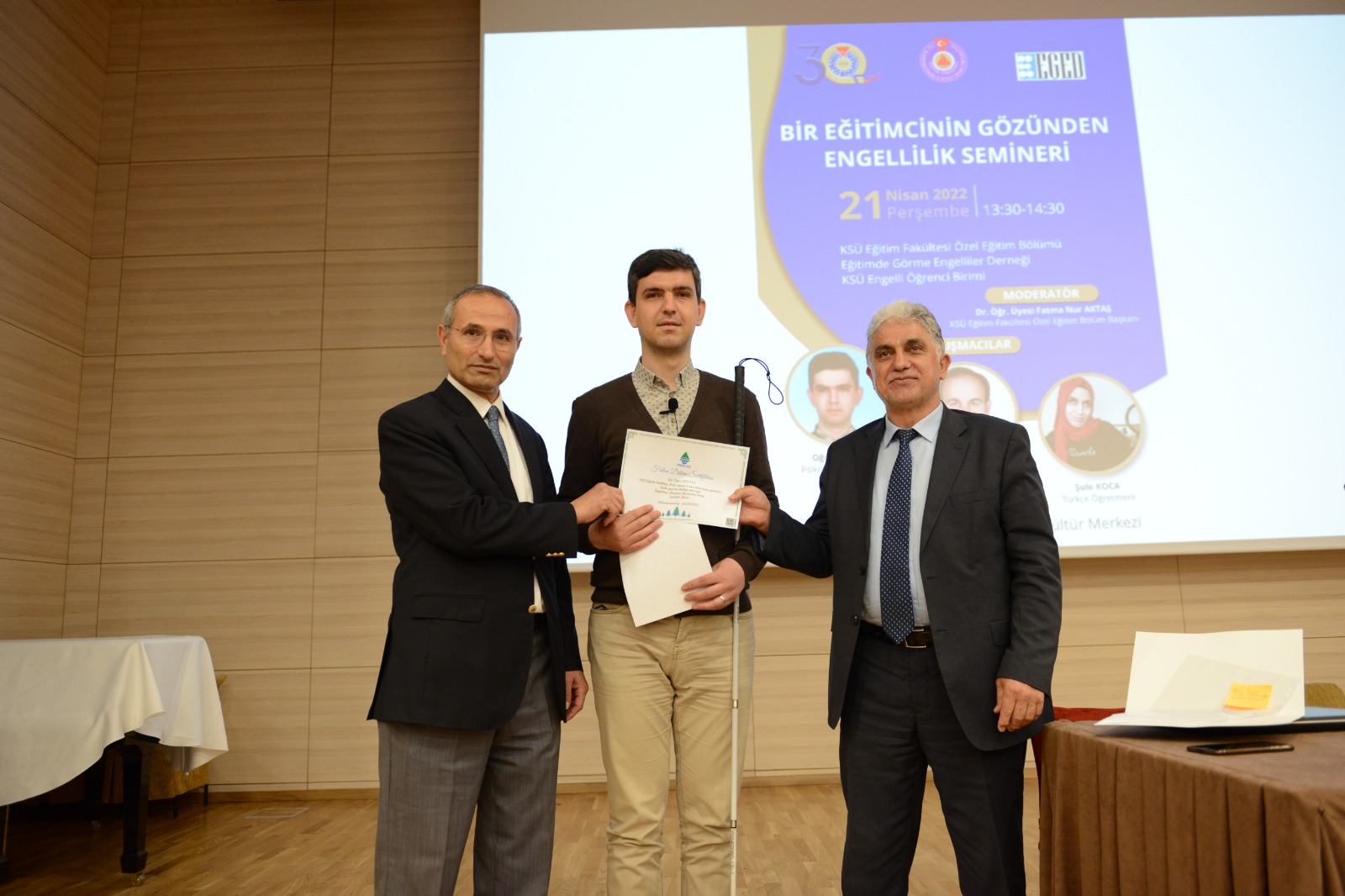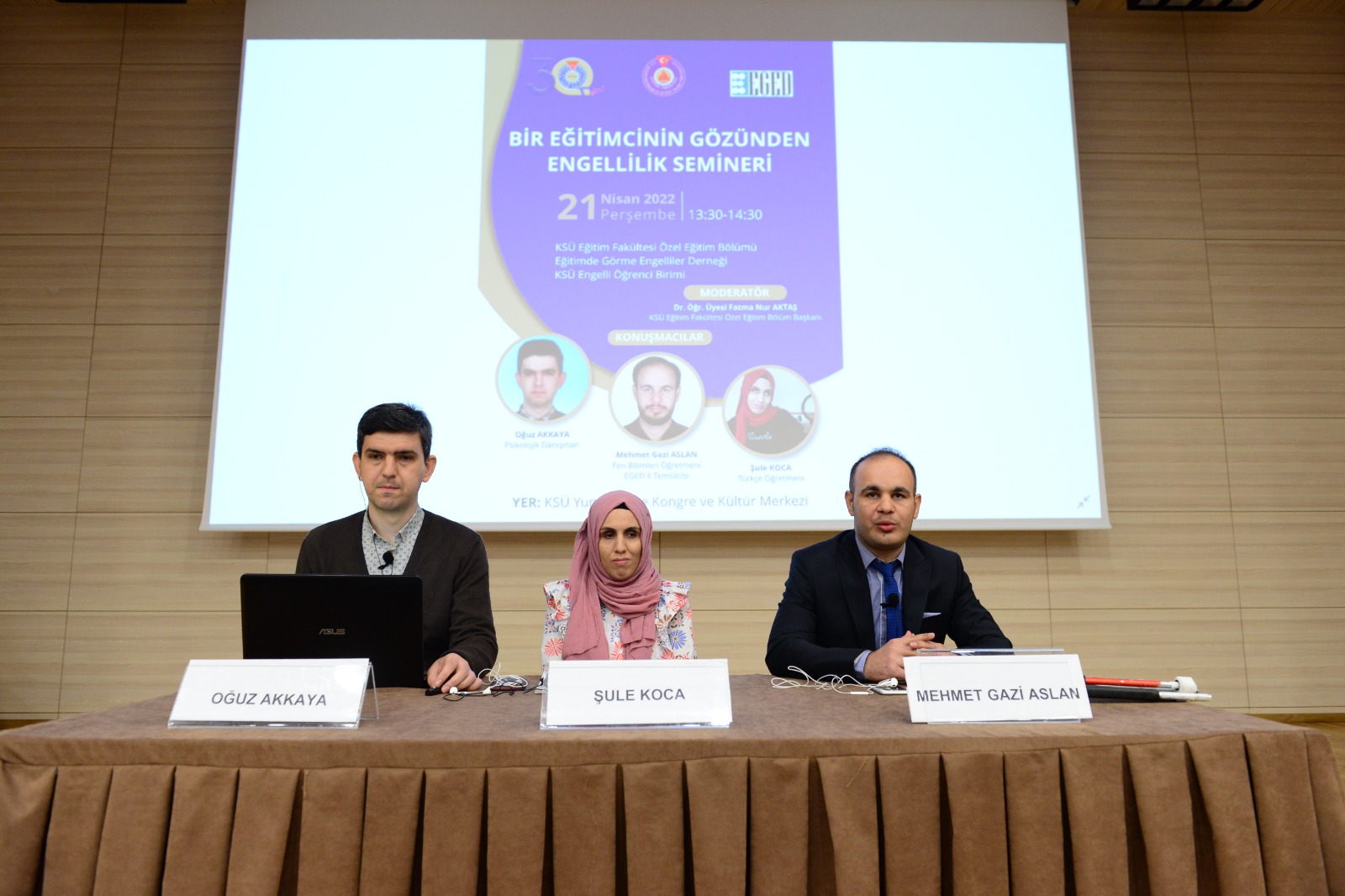 Üniversitemiz Yunus Emre Kongre ve Kültür Merkezi Kahverengi Salon’da gerçekleştirilen ve yürütücülüğünü Özel Eğitim Bölüm Başkanı Dr. Öğr. Üyesi Fatma Nur AKTAŞ’ın üstlendiği etkinlikte, EGED Kahramanmaraş İl Temsilcisi ve Fen Bilgisi Öğretmeni Sn. Mehmet Gazi ASLAN dernek çalışmalarından ve Türkçe Öğretmeni Sn. Şule KOCA görme engelli bir birey olarak eğitim ve meslek yaşamındaki deneyimlerinden bahsederken Psikolojik Danışman Sn. Oğuz AKKAYA ‘Eğitimde Hak Temelli Yaklaşım ve Uygulama Örnekleri’ başlıklı sunumunu gerçekleştirdi.