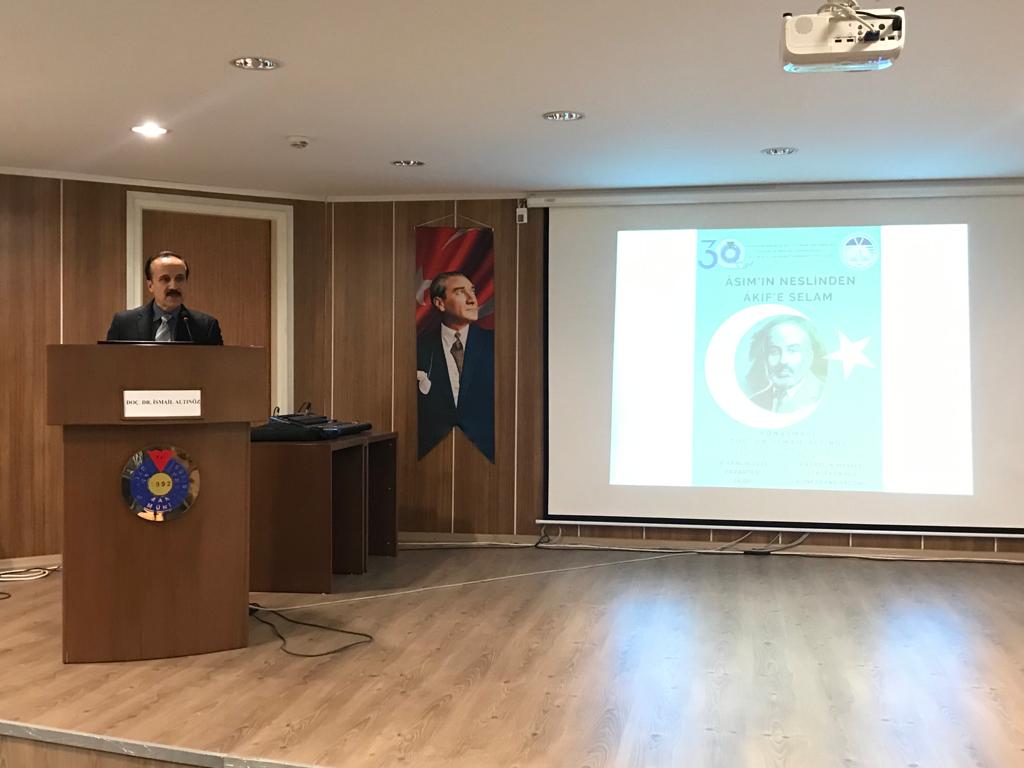 Konuşmacı Doç. Dr. ALTINÖZ, Mehmet Akif ERSOY’in tarihi şahsiyeti ve öneminden bahsederek başladığı konuşmasında Âkif'in kendisi ve çalışmaları hakkında geniş bilgiler vermiştir.