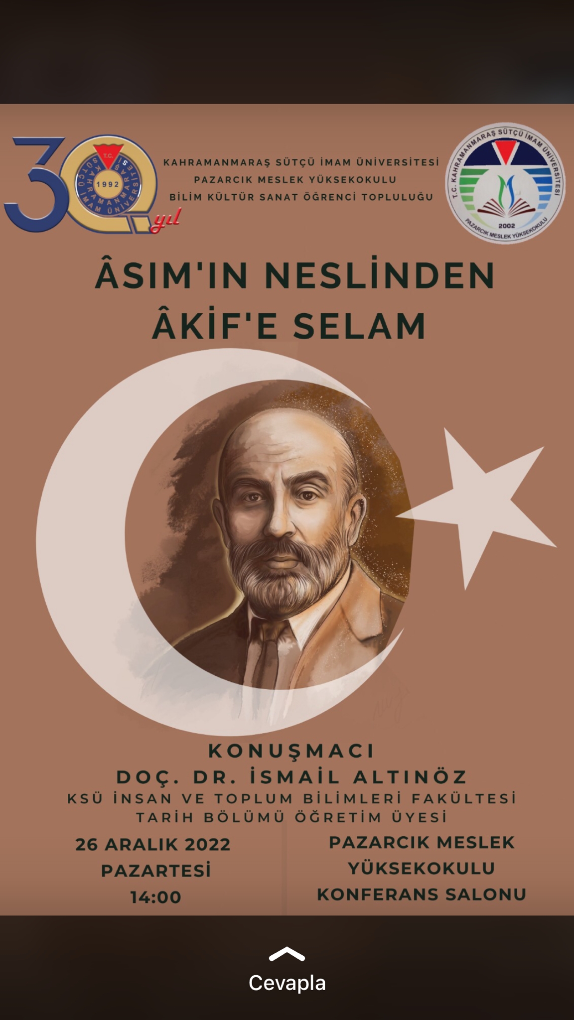 Kahramanmaraş Sütçü İmam Üniversitesi (KSÜ) Pazarcık Meslek Yüksekokulu Müdürlüğü Bilim Kültür Sanat Öğrenci Topluluğu tarafından “Milli Şair” Mehmet Akif Ersoy’un vefatının 86. yıldönümü dolayısıyla “Âsım'ın Neslinden Âkif'e Selam” konferansı düzenlendi.