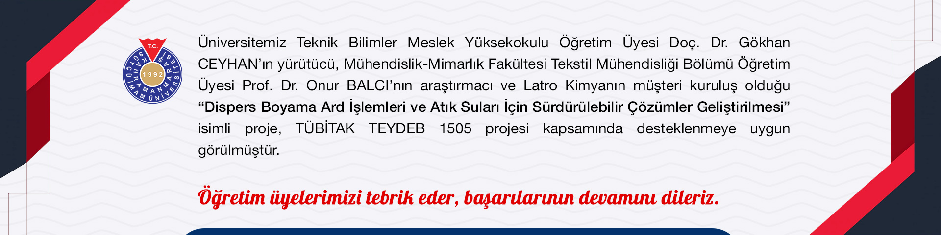 Dispers Boyama Ard İşlemleri ve Atık Suları İçin Sürdürülebilir Çözümler Geliştirilmesi projesine TÜBİTAK'tan destek