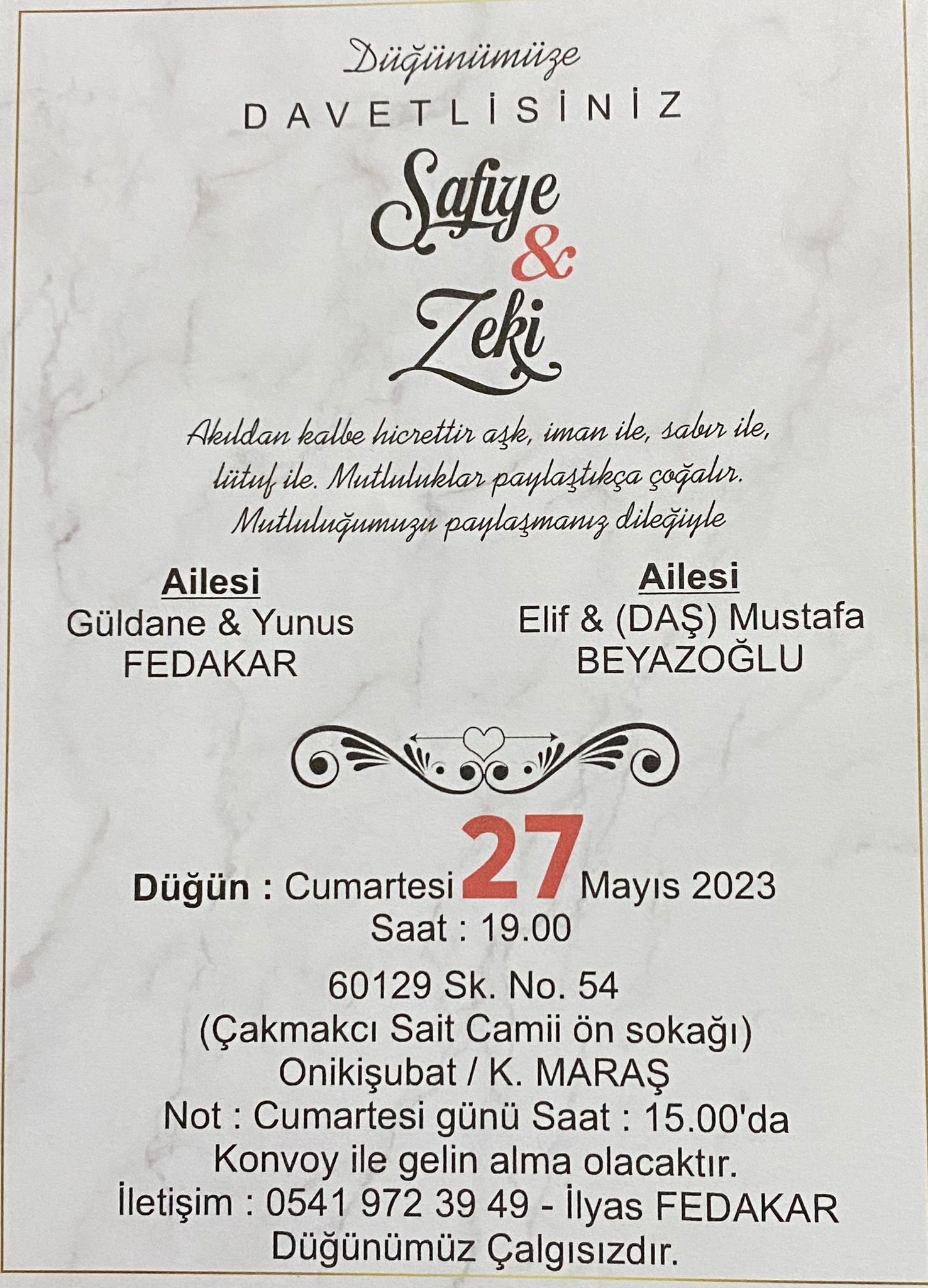Teknik Bilimler Meslek Yüksekokulu personeli Yunus FEDAKAR’ın oğlunun 27 Mayıs 2023 Cumartesi günü saat 19.00-23.00 arasında (Çakmakcı Sait Camii Ön Sokağı) kendi evinde düğünü olacaktır. FEDAKAR ailesini ve genç çifti tebrik eder, mutluluklar dileriz.