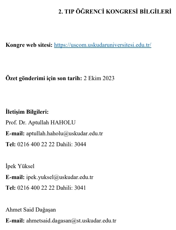 Üsküdar Üniversitesi NP Sağlık Yerleşkesi Tıp Fakültesi bünyesinde bulunan İbni Sina Oditoryumu'nda uluslararası katılımlı 2. Tıp Öğrenci Kongresi düzenlenecektir.