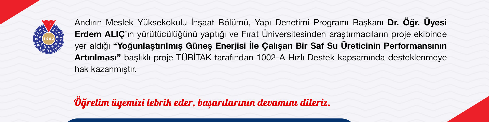 Yoğunlaştırılmış Güneş Enerjisi İle Çalışan Bir Saf Su Üreticinin Performansının Artırılması projesi TÜBİTAK tarafından 1002-A Hızlı Destek kapsamında desteklenmeye hak kazanmıştır