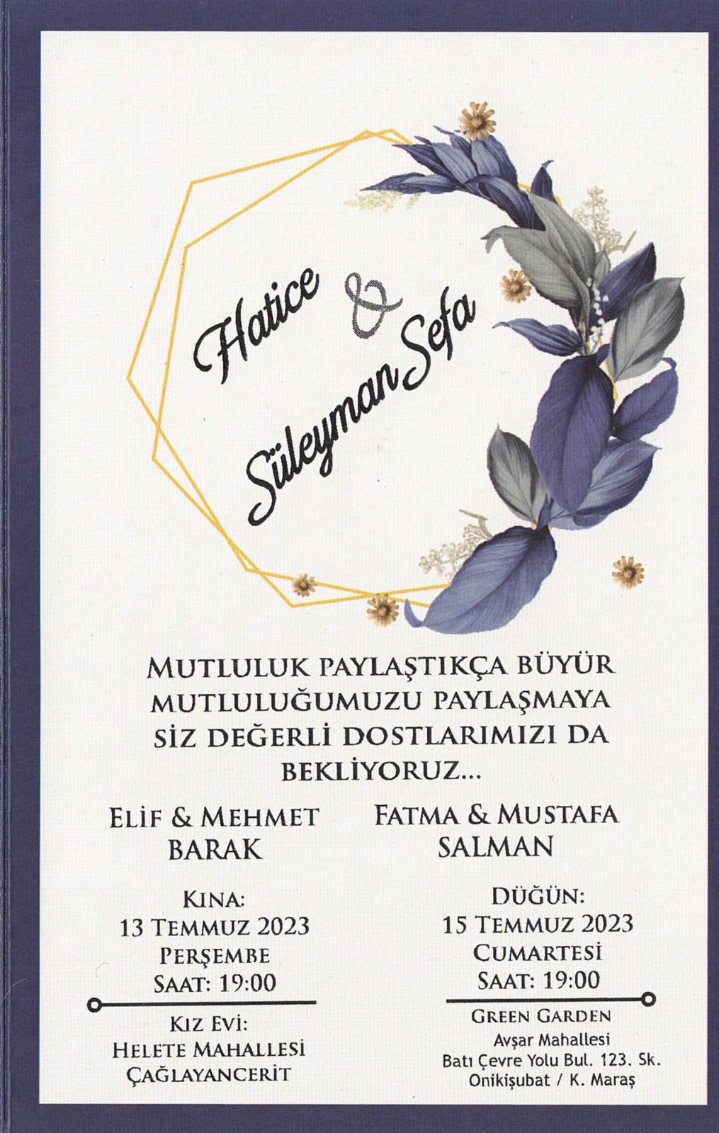 Basın ve Halkla İlişkiler Müdürü Mustafa SALMAN'ın oğlu 15 Temmuz 2023 Cumartesi günü saat 19.00'da Green Garden düğün salonunda yapılacak düğün töreni ile dünya evine girecektir. SALMAN ailesini ve genç çifti tebrik eder, mutluluklar dileriz.